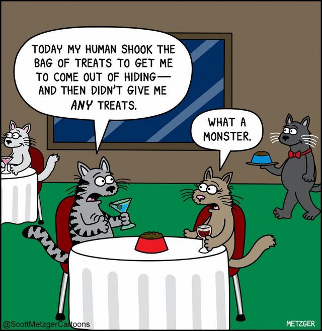 "Oggi il mio umano ha agitato il sacchetto dei croccantini per farmi uscire dal mio nascondiglio - e poi non me ne ha dato nemmeno uno!"