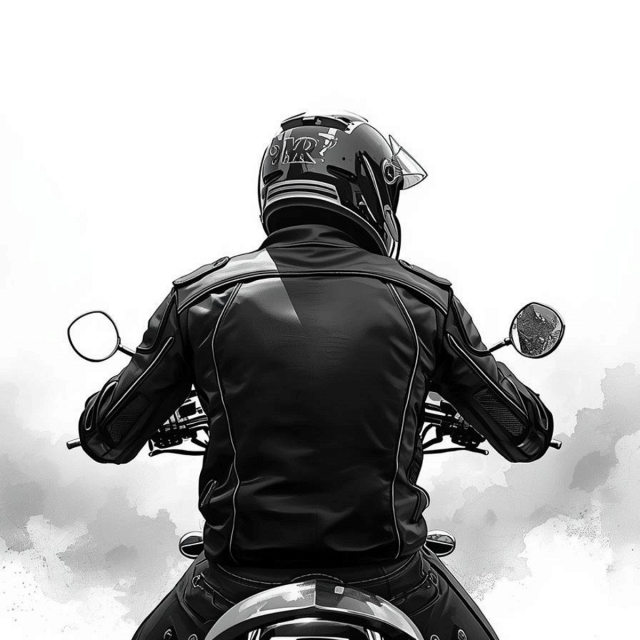 la schiena di un motociclista, forme perfette sotto la giacca di pelle.