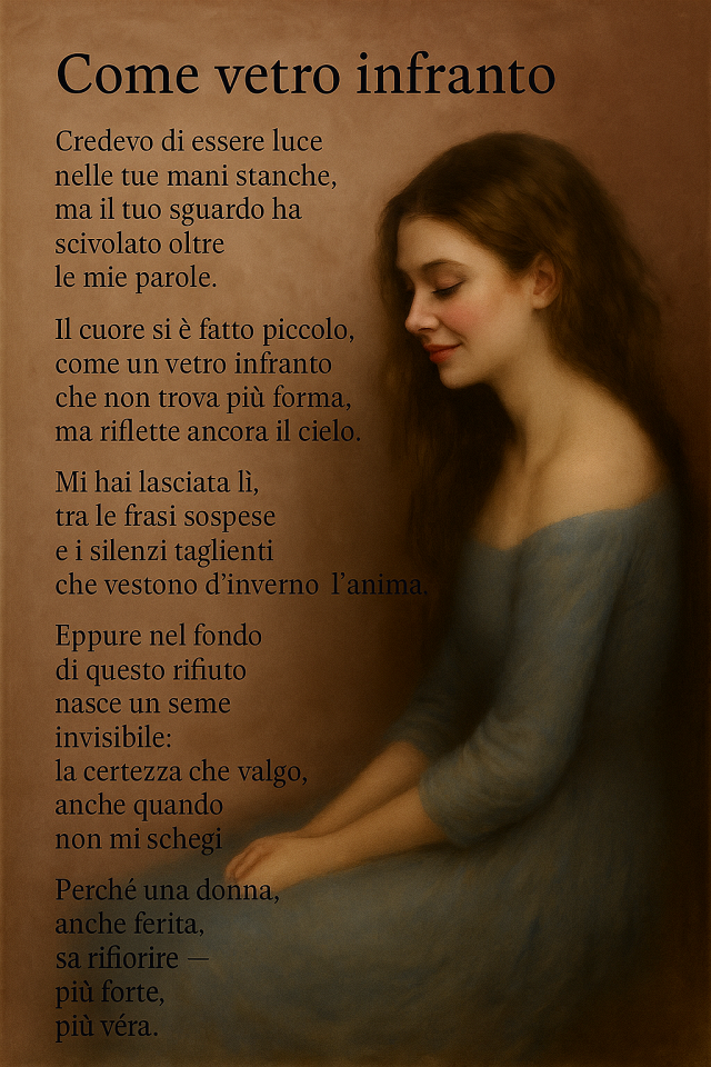 C è una parte di me che non ama apparire, ma lasciarsi scoprire piano, come un riflesso che si svela solo a chi sa guardare oltre la superficie. Dietro ogni parola c è un emozione vera, dietro ogni silenzio una storia. Non cerco approvazione, ma autenticità: un passo alla volta, nella luce discreta di ciò che resta vero anche quando tutto cambia.