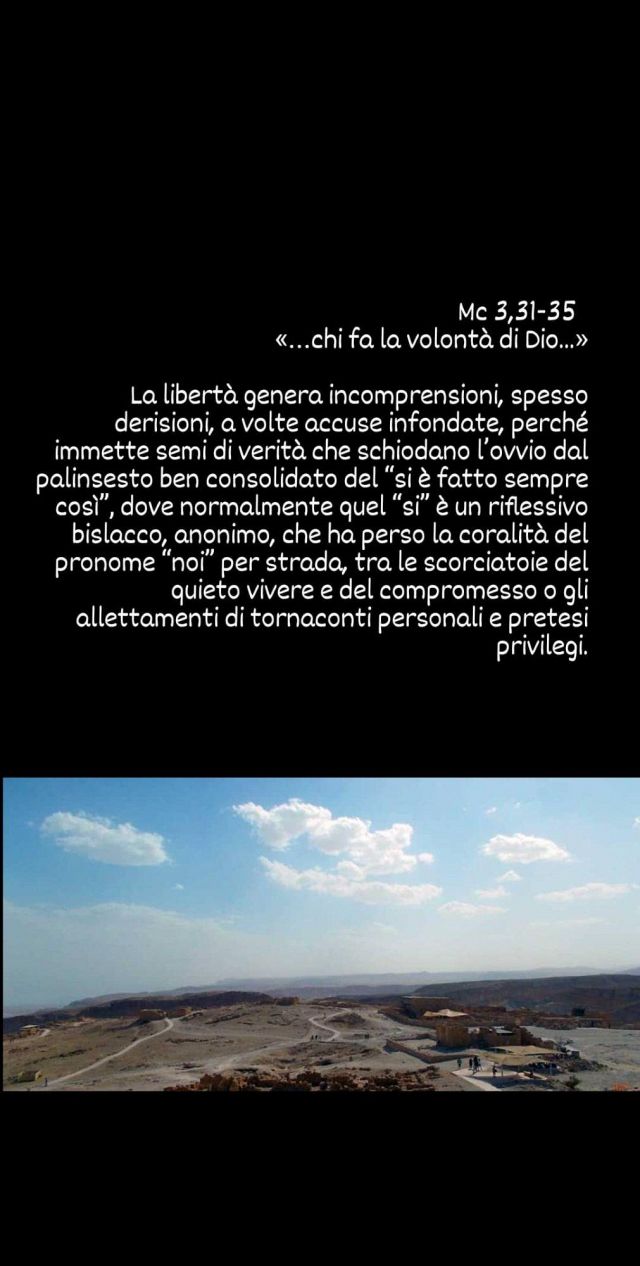 I “suoi” non capiscono e non vogliono sapere altro, intendono solo riportarlo a casa. Quel che si dice di lui li preoccupa e certo non giova al buon nome della famiglia. Ma rimarranno “fuori” perché Gesù, rispondendo alla sua singolare vocazione, è andato oltre, ha assunto una missione che l’ha portato a uscire dal clan e dalle sue logiche: sì, ormai “è fuori” dalle determinazioni del senso comune e del sangue, da reti di vincoli, abitudini, convenzioni… trascese nel compiersi di una promessa.