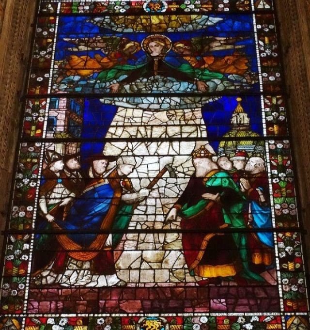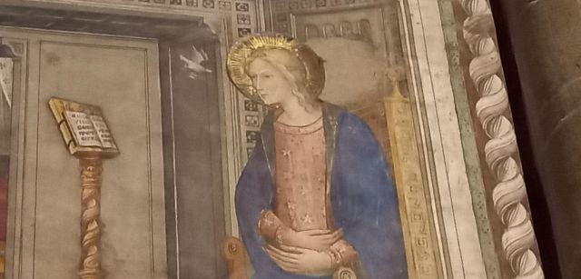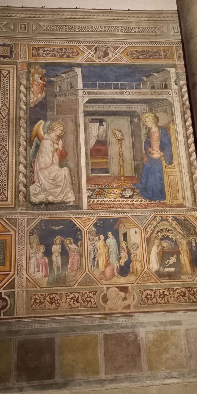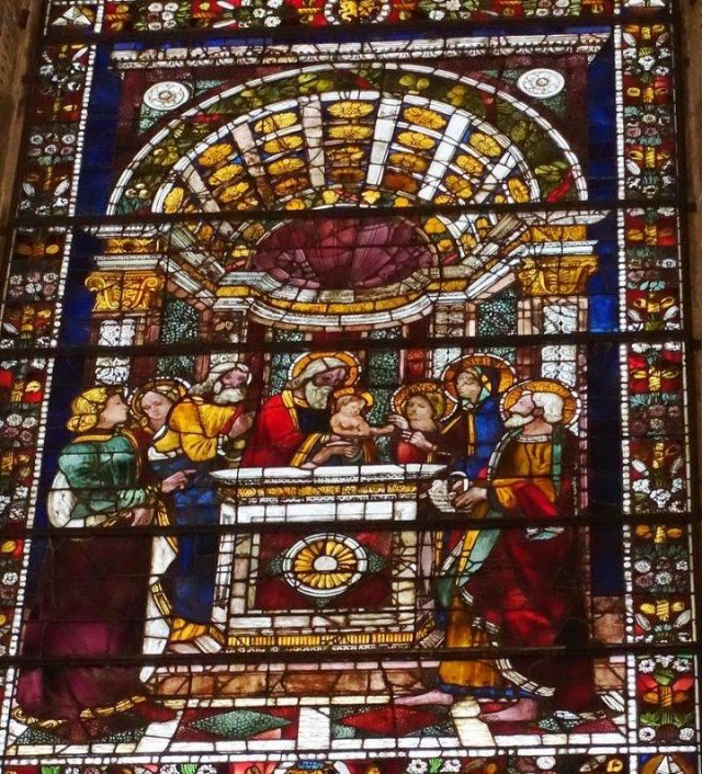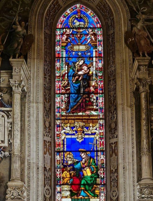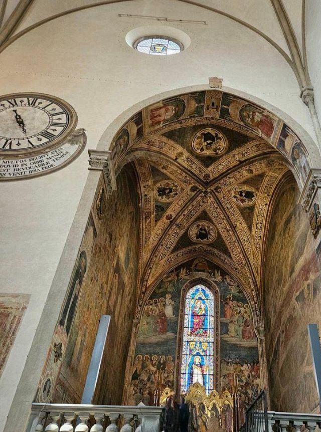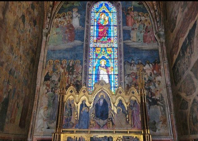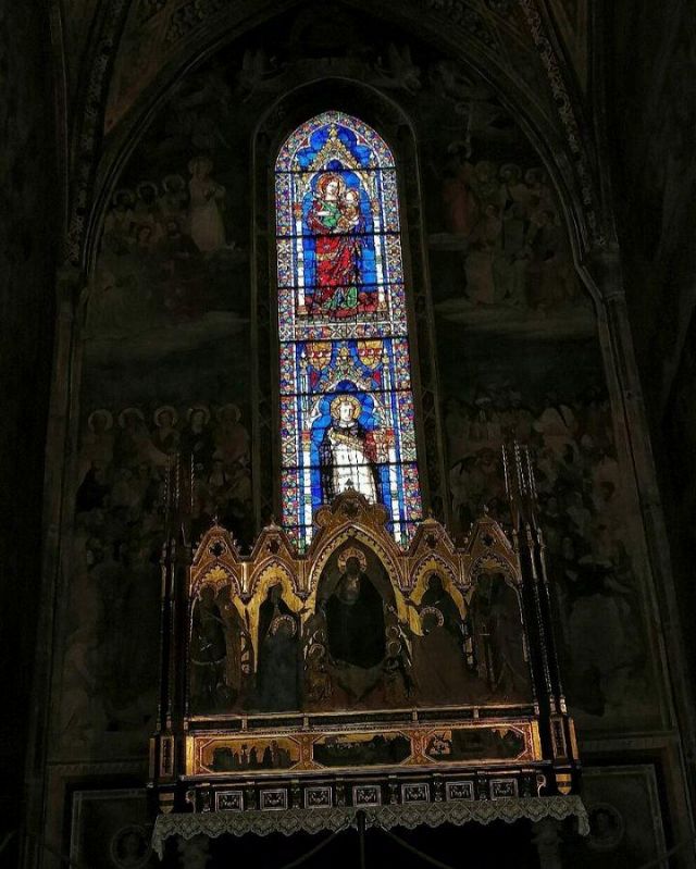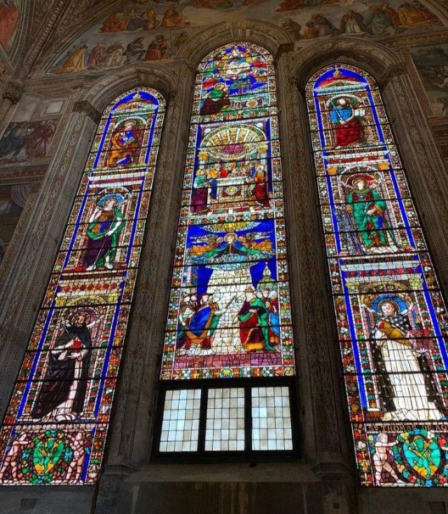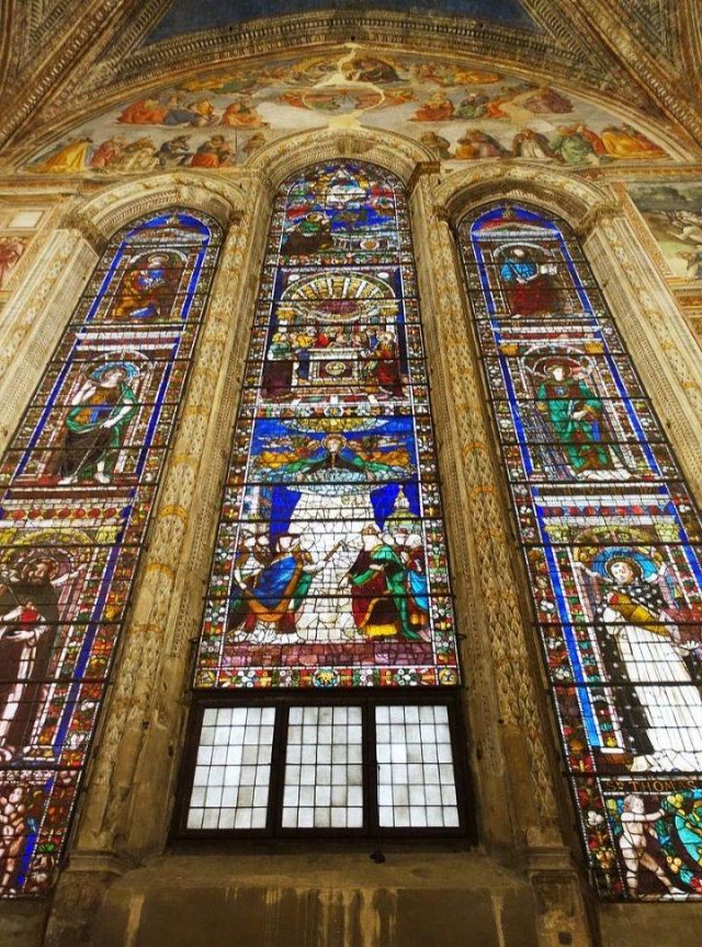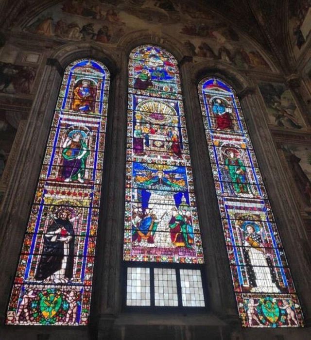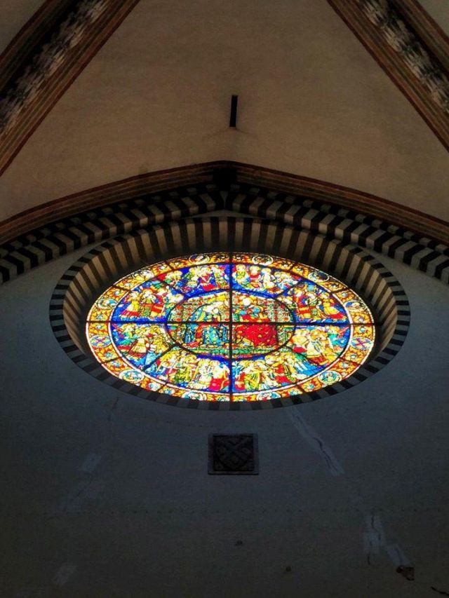 Domenico Ghirlandaio a progettare le preziose vetrate policrome nel 1491, oltre a disegnare tutti i cartoni degli affreschi laterali, di fondo e della volta. Nell’anno seguente, nel 1492, Alessandro Angolani le realizzò con una cura quasi maniacale.