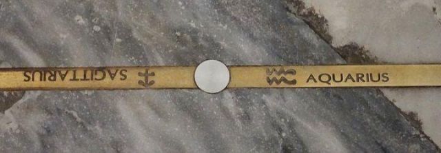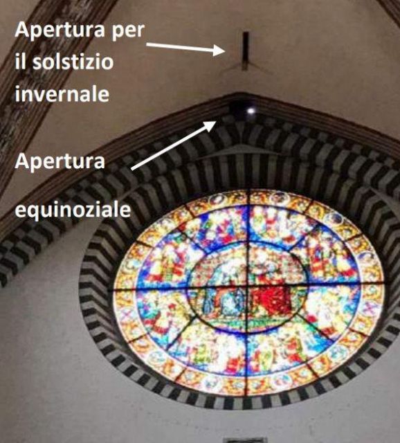 La meridiana con gnomone nel rosone permette di osservare il suo funzionamento durante tutto l’anno: solstizi (estivo ed invernale), equinozi (di Primavera ed Autunno) e passaggi intermedi del sole nelle varie costellazioni.