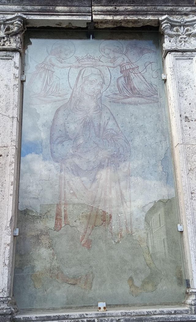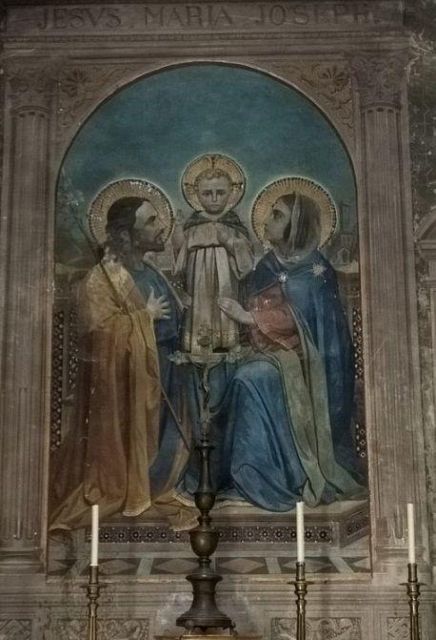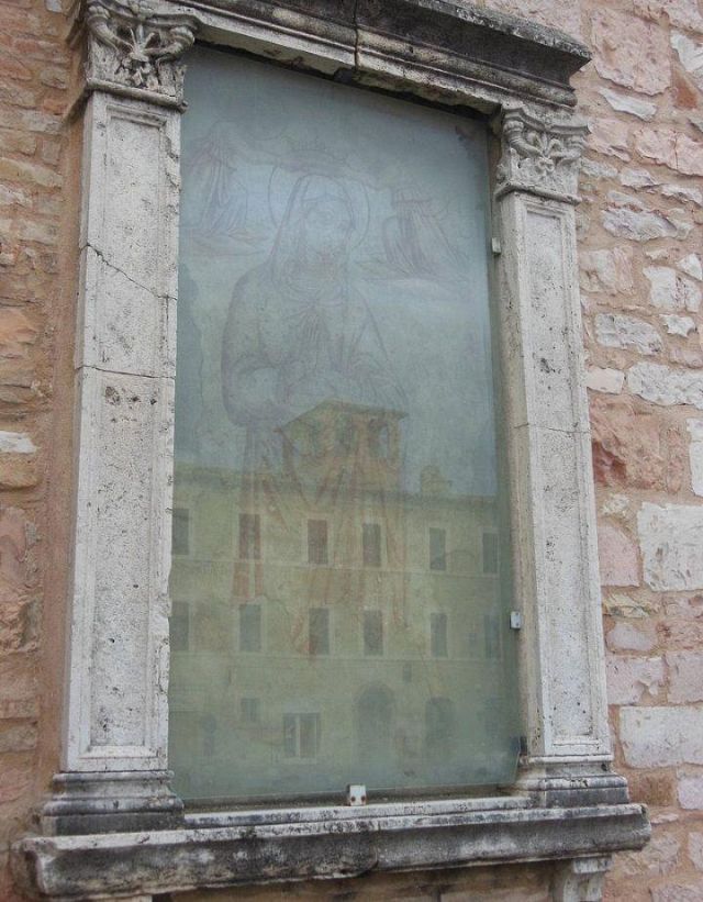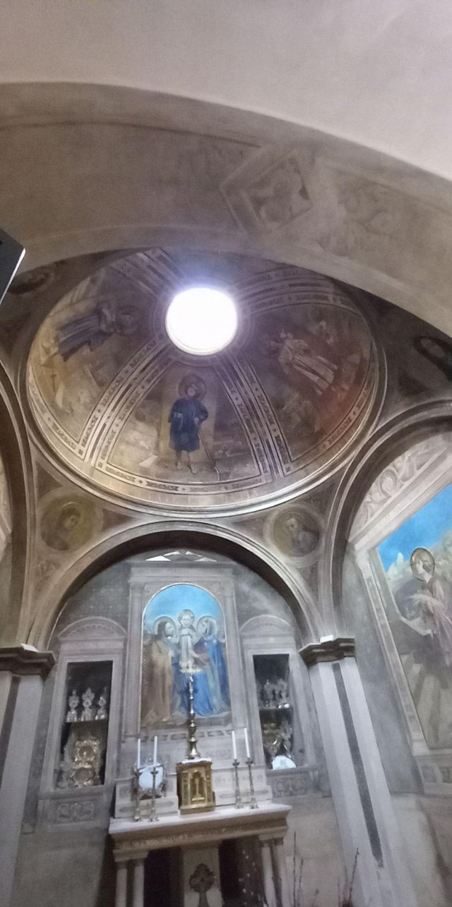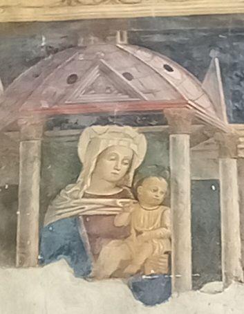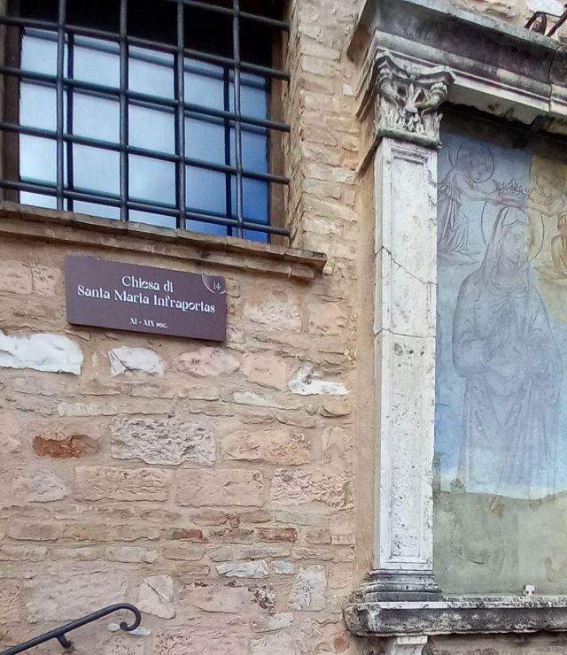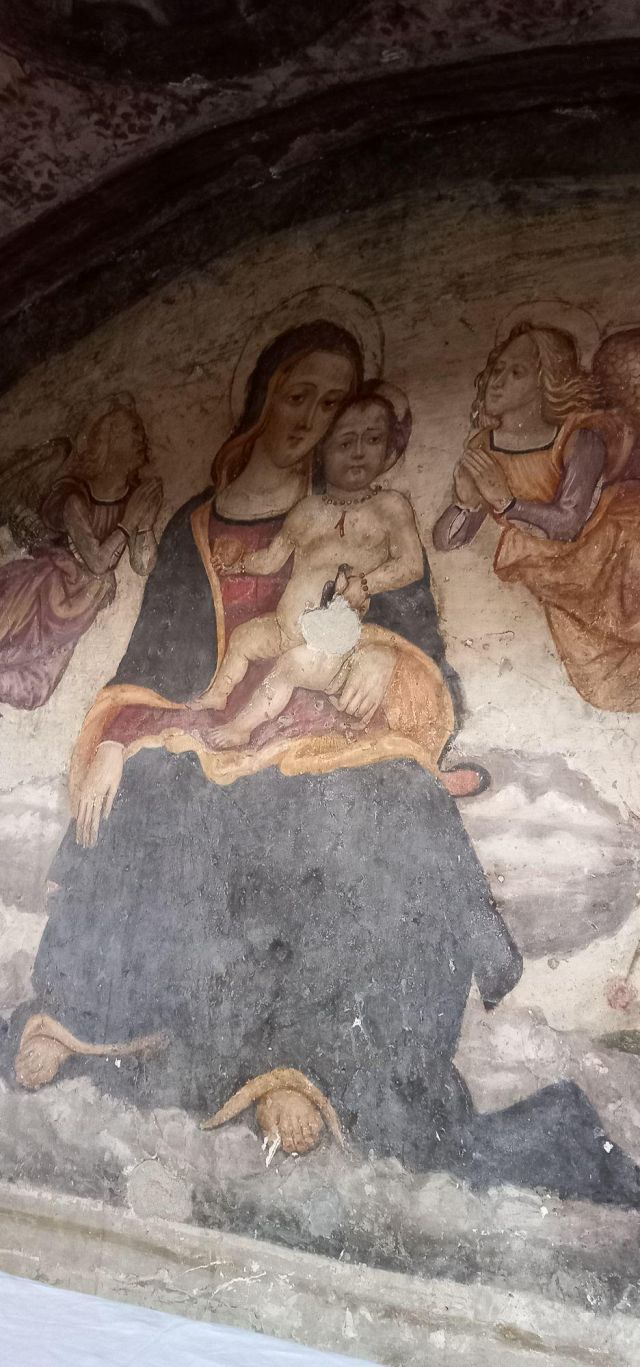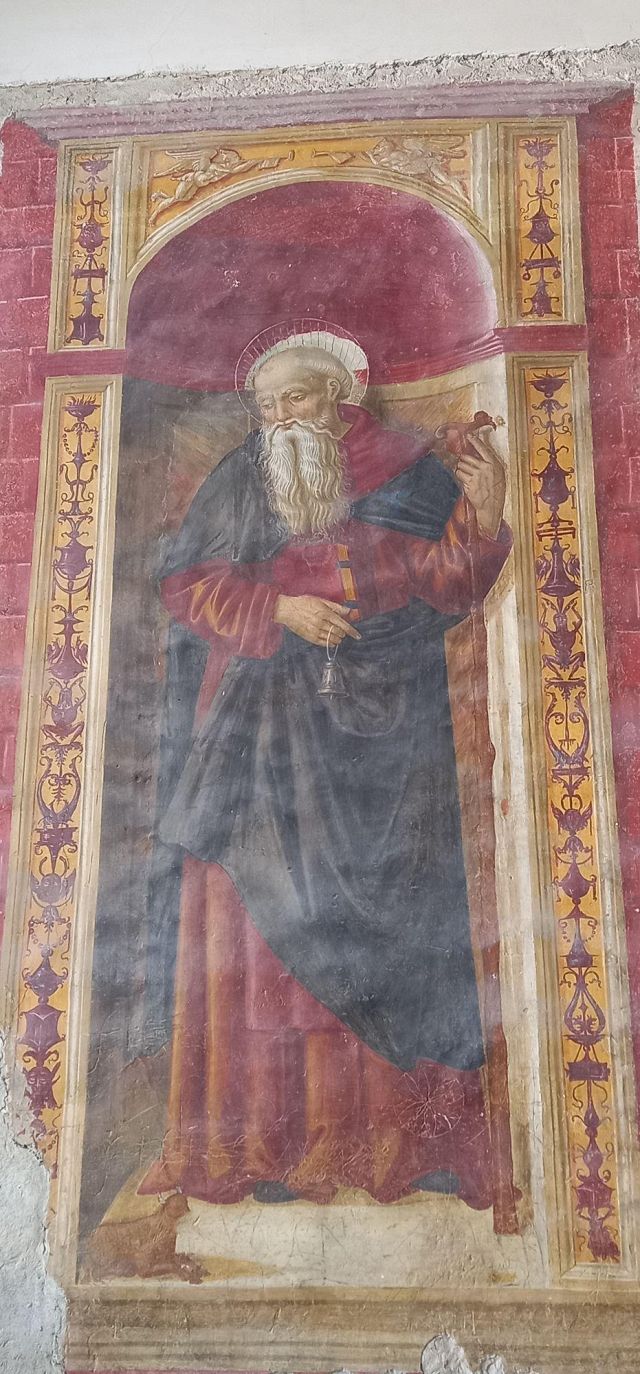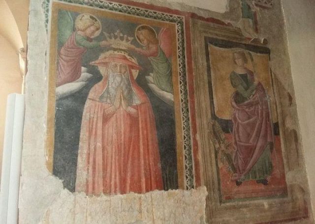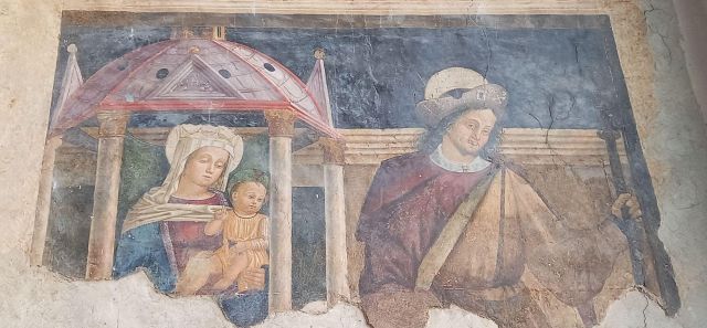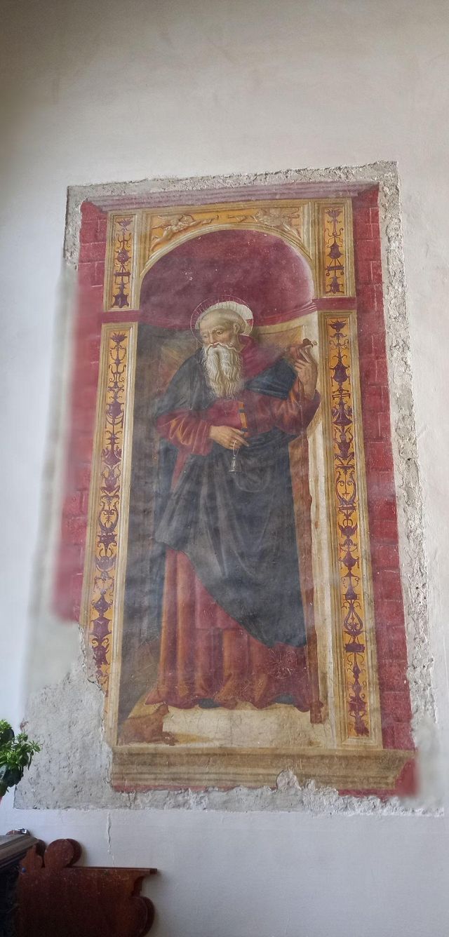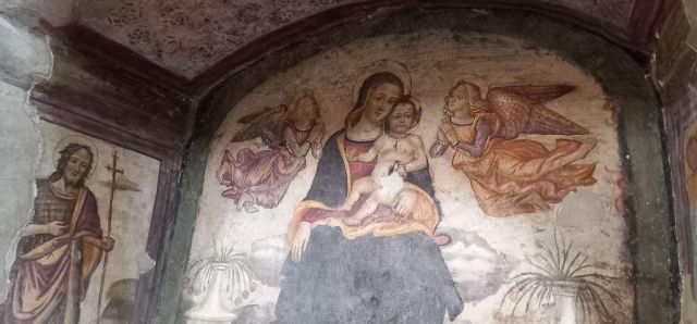 A destra del portico vi è una edicola risalente al 1480 con un affresco; in fondo al fianco destro si trova la torre campanaria romanica.