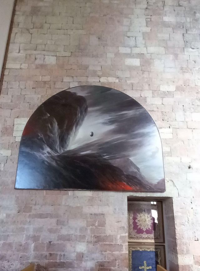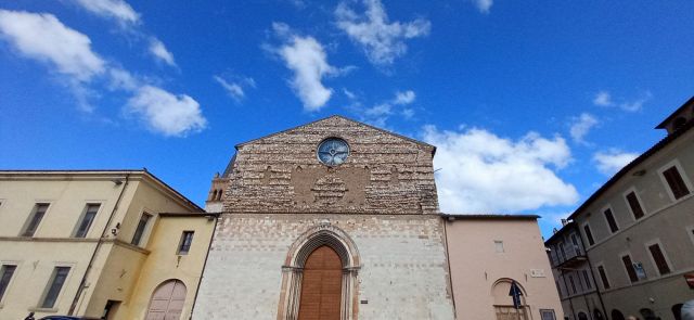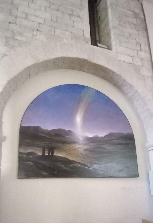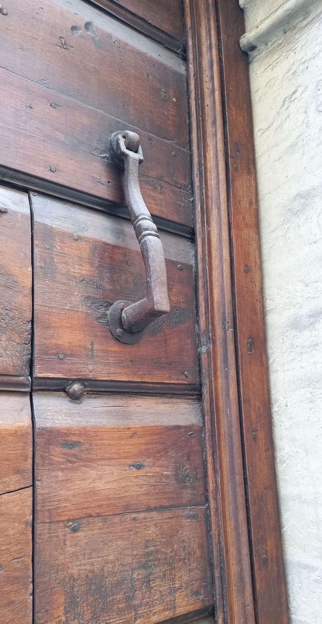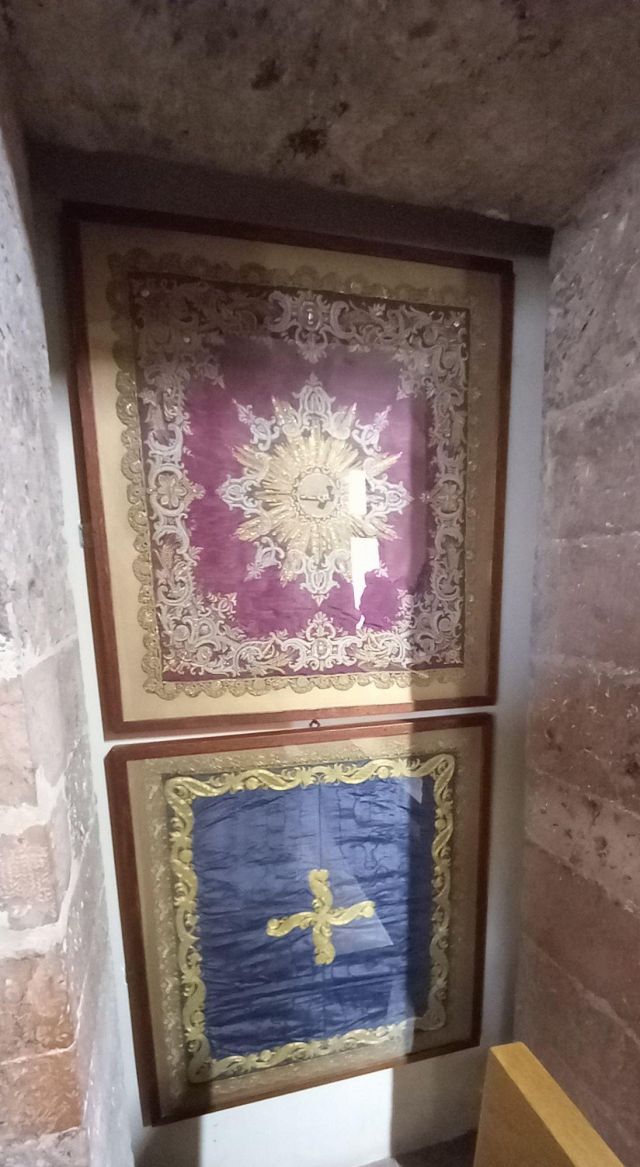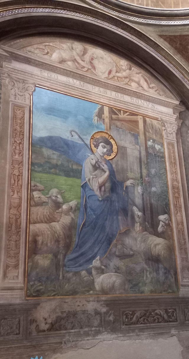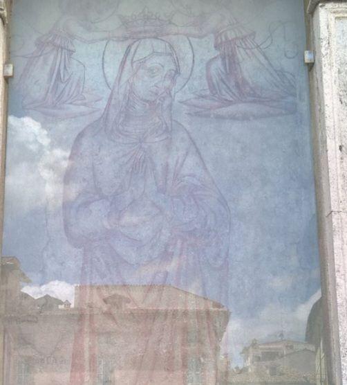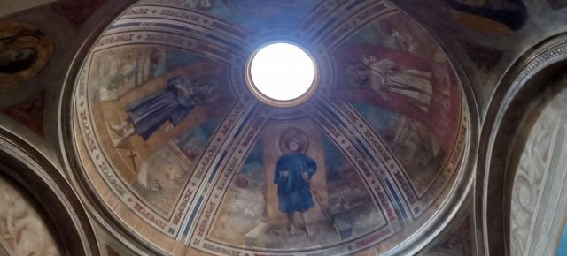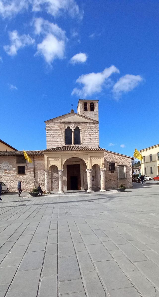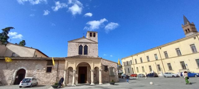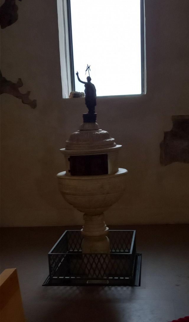 A destra del portico vi è una edicola risalente al 1480 con un affresco; in fondo al fianco destro si trova la torre campanaria romanica.