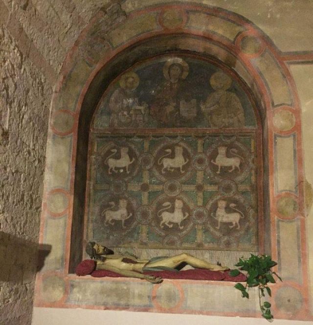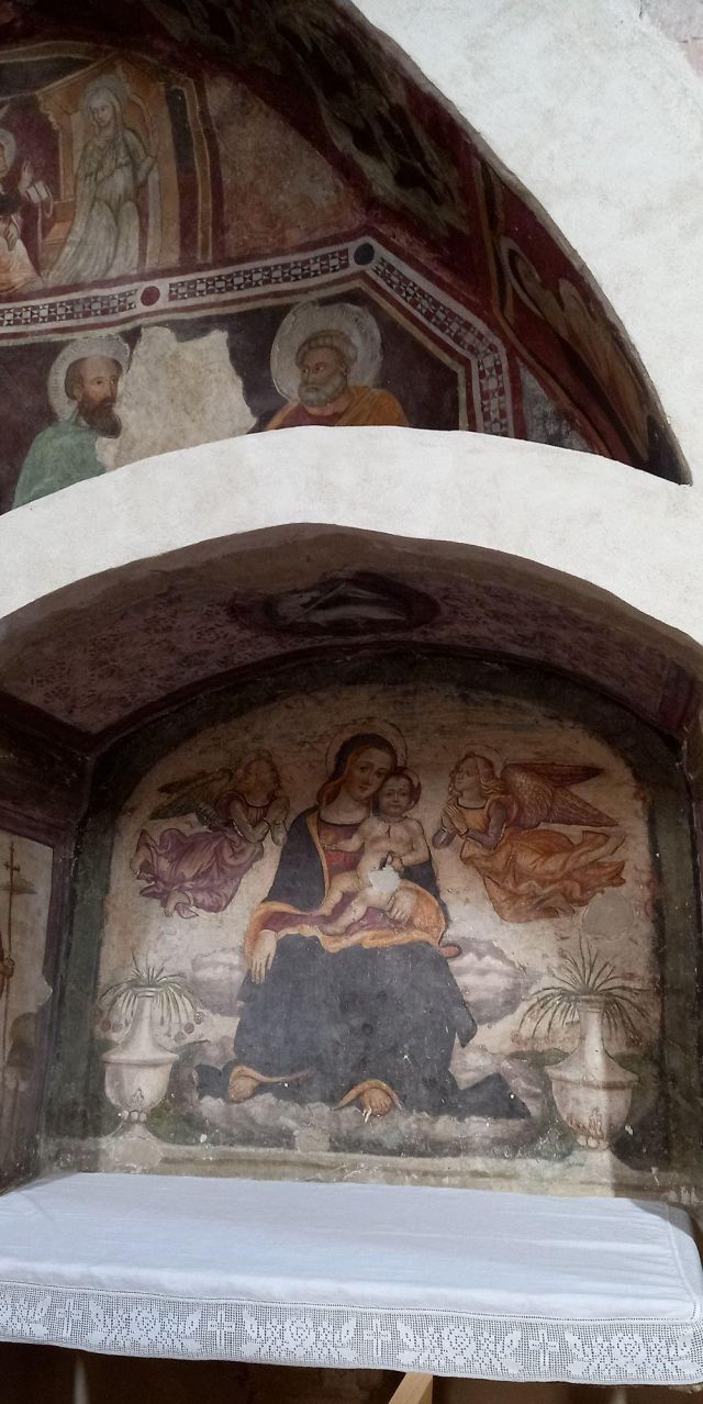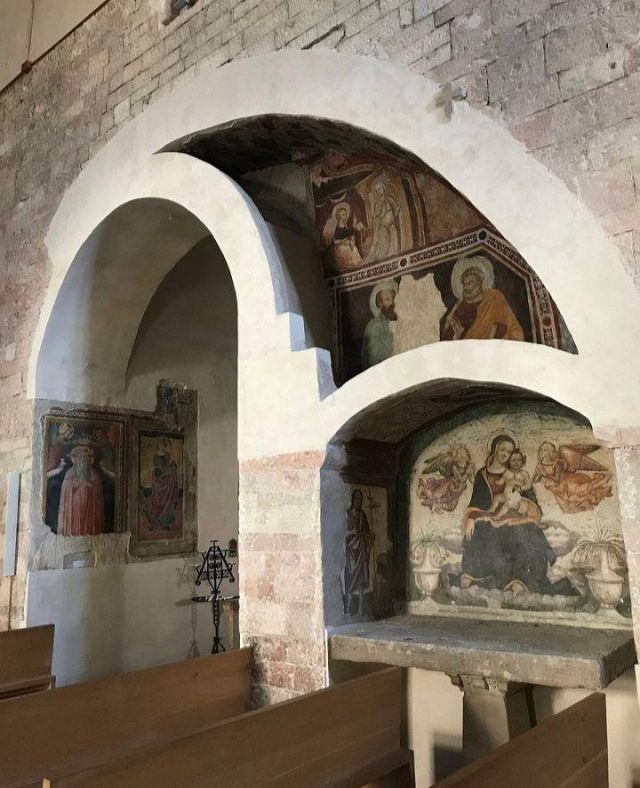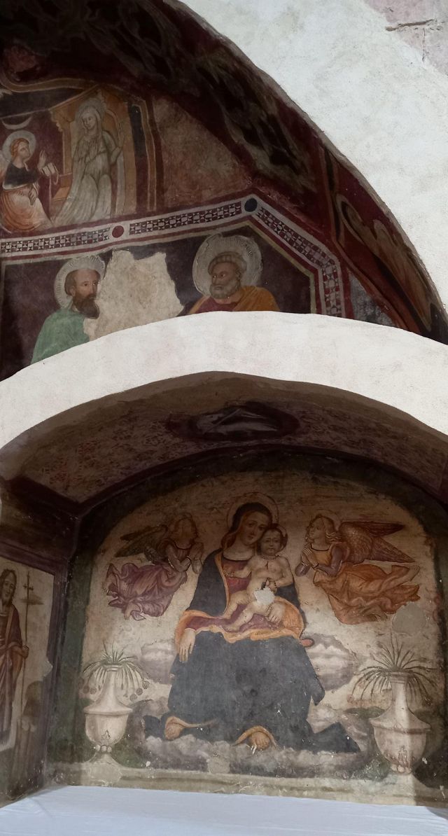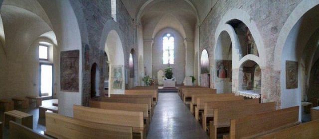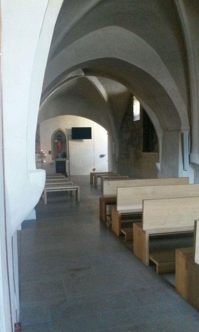 L'interno a tre navate è diviso da pilastri; la navata mediana è con volta a botte, mentre le laterali, aggiunte nel corso del XV secolo, sono con volte a crociera. Alle pareti e sui pilastri si vedono numerosi affreschi votivi.