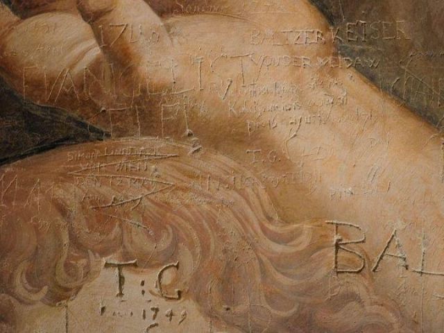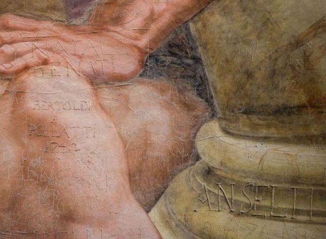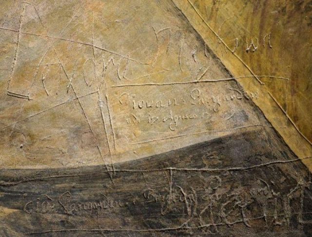 Sono circa settecento le scritte che figurano sulle pareti della Camera dei Giganti, capolavoro di Giulio Romano, identificate e trascritte. Esse vanno dal 1560 fino alle più recenti che risalgono alla metà del Novecento, quando il palazzo non era sorvegliato. La maggior parte delle incisioni sono opera dei lanzichenecchi austriaci, soldati del Sacro Romano Impero, che occuparono Palazzo Te dal Sacco di Mantova nel 1630 fino alla guerra di successione polacca nel 1735, trasformando la villa in caserma.