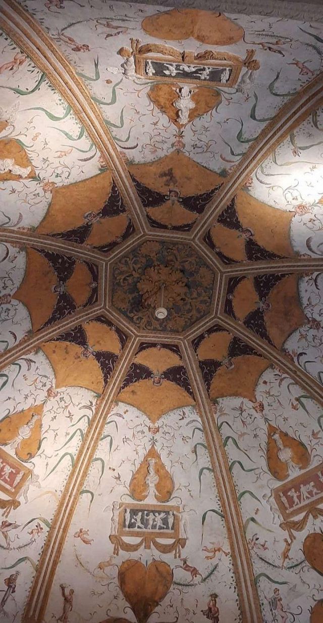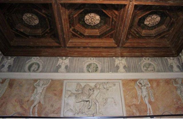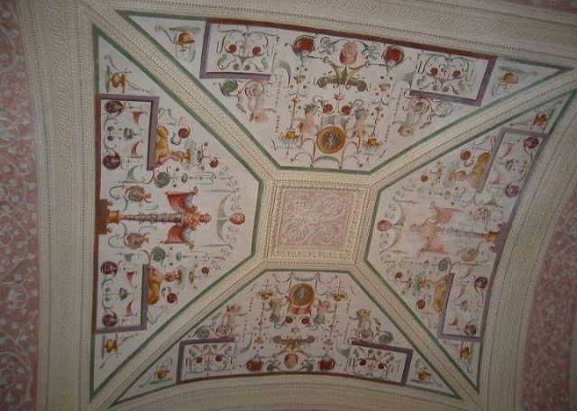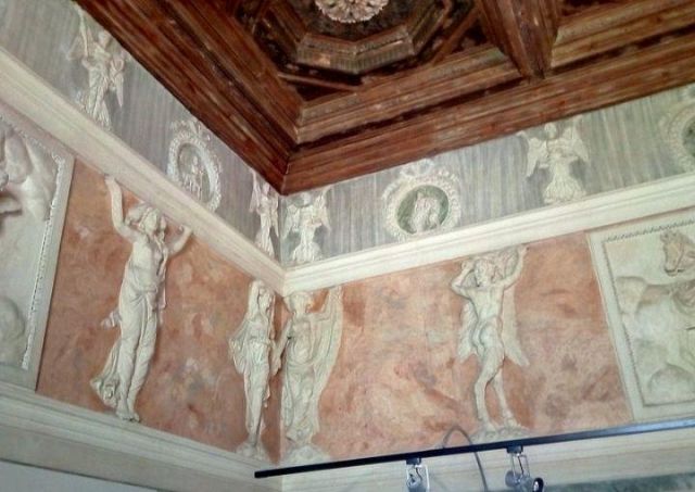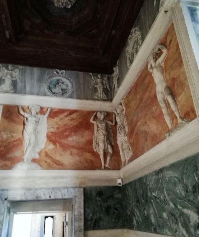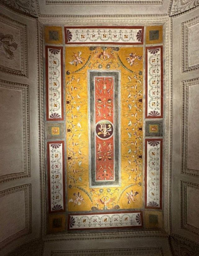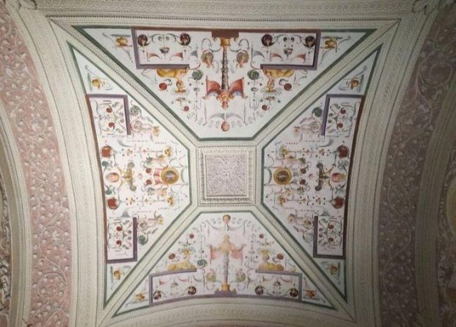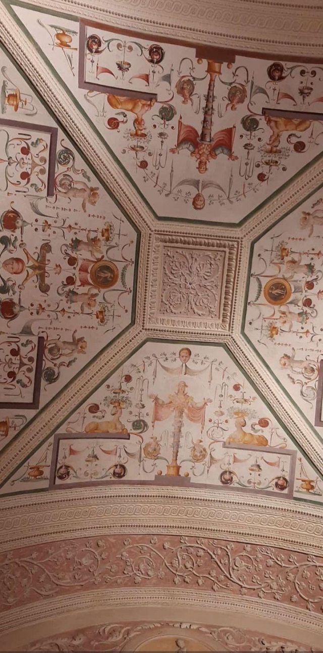 Questo ambiente di modeste dimensioni separa l’ala monumentale del palazzo da quella delle stanze private, meno riccamente decorate.