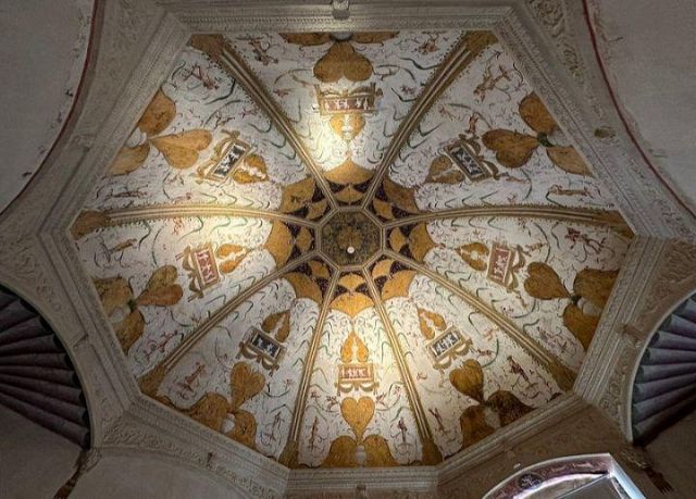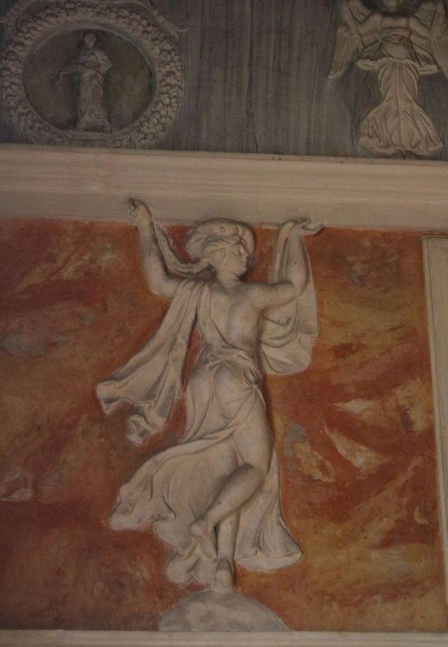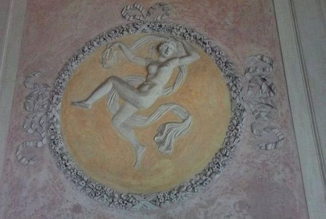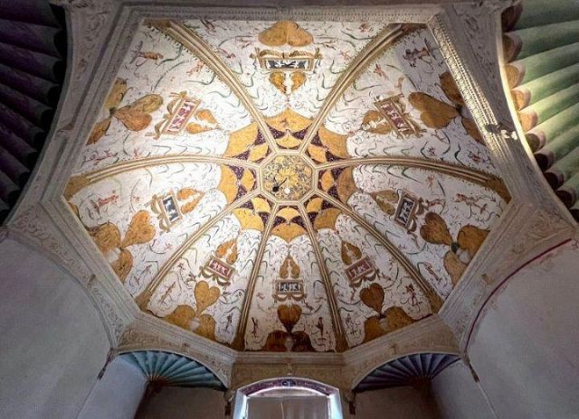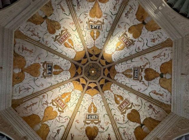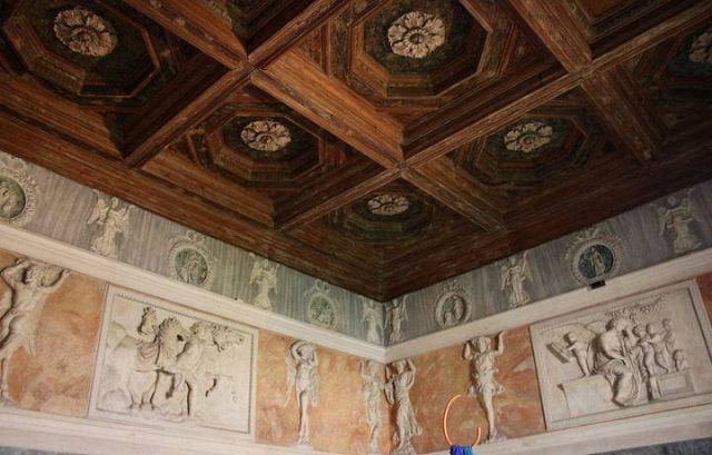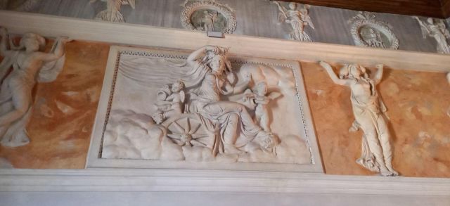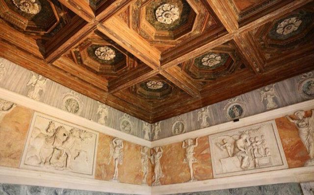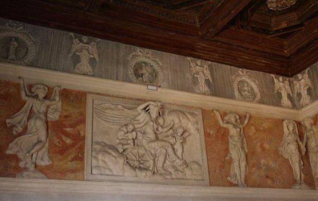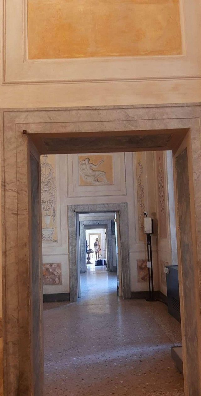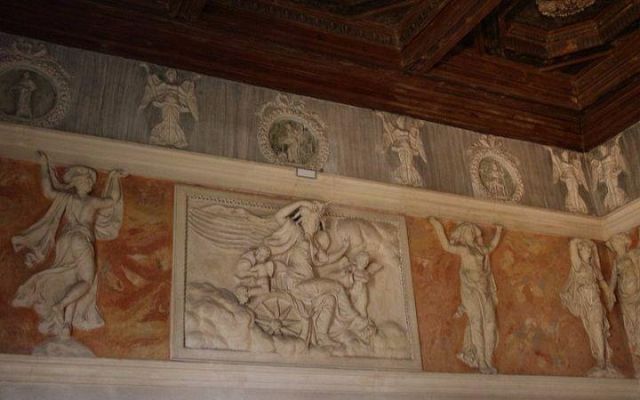 Questo ambiente di modeste dimensioni separa l’ala monumentale del palazzo da quella delle stanze private, meno riccamente decorate.