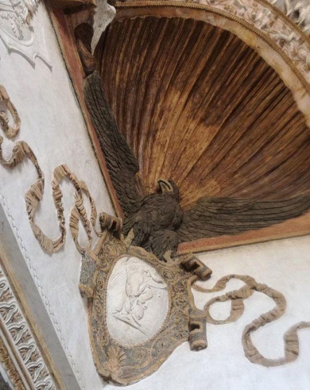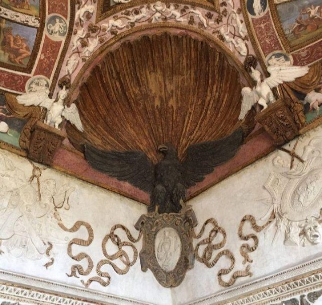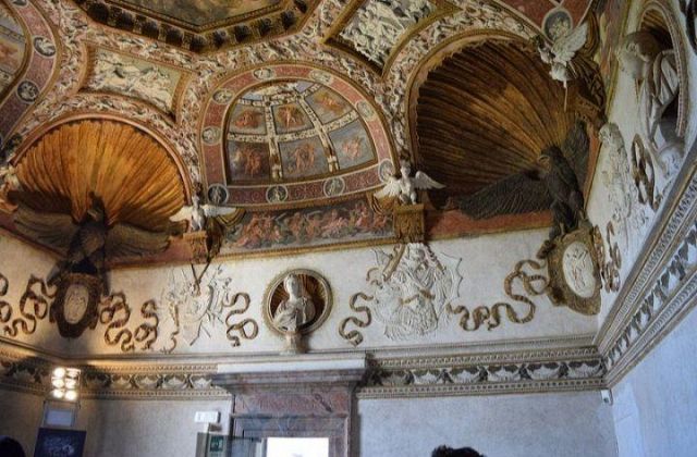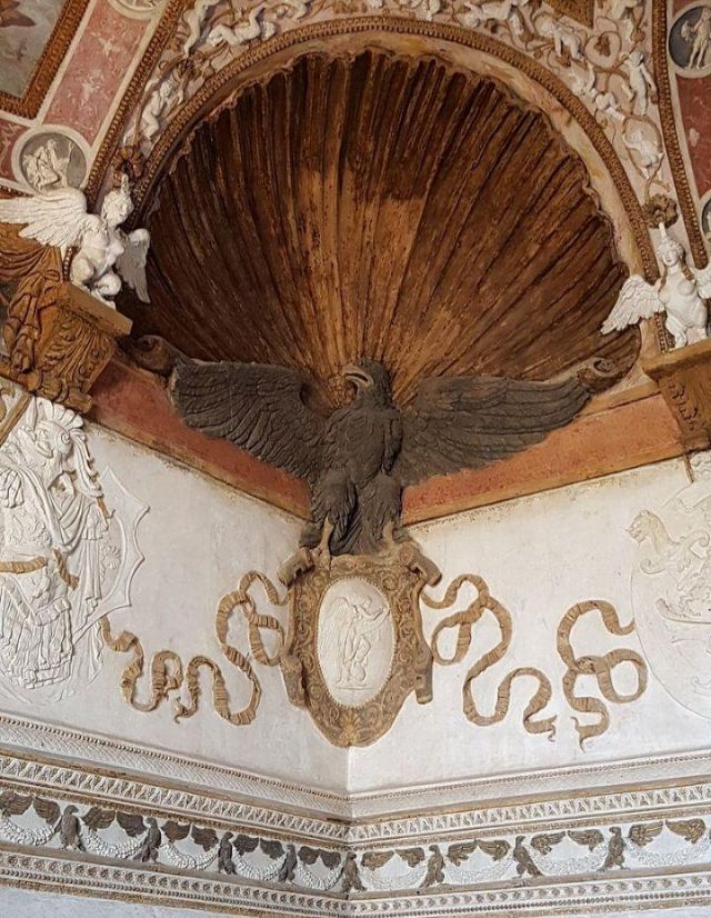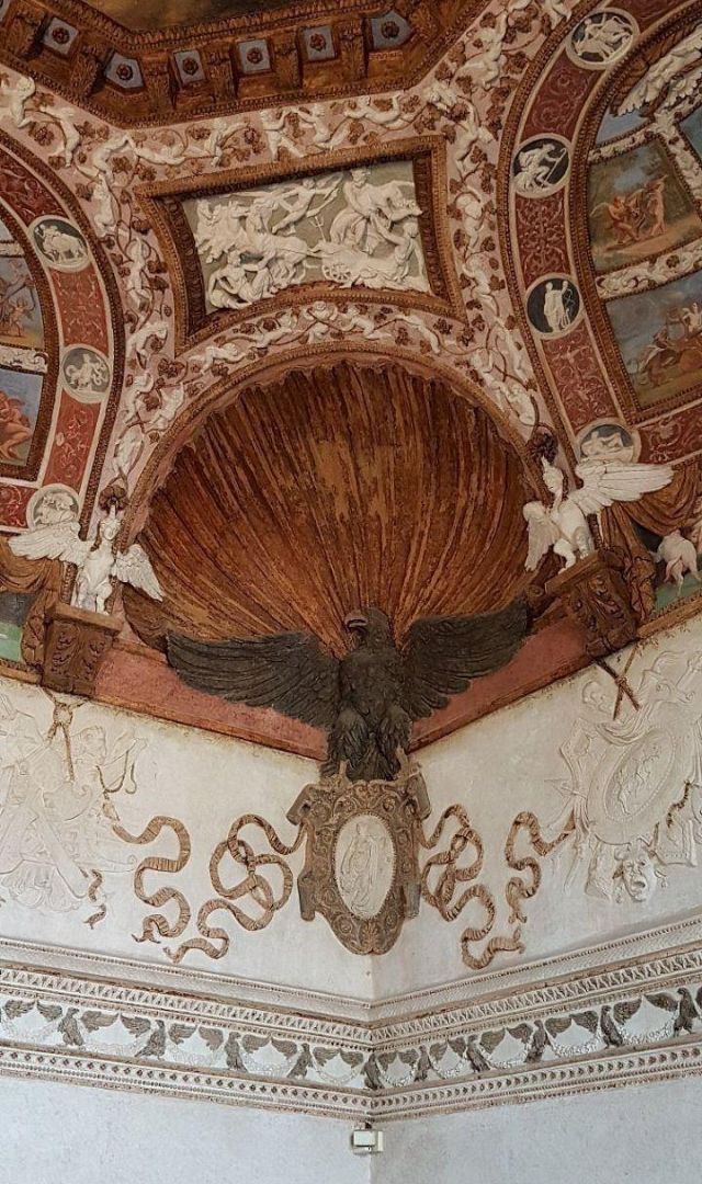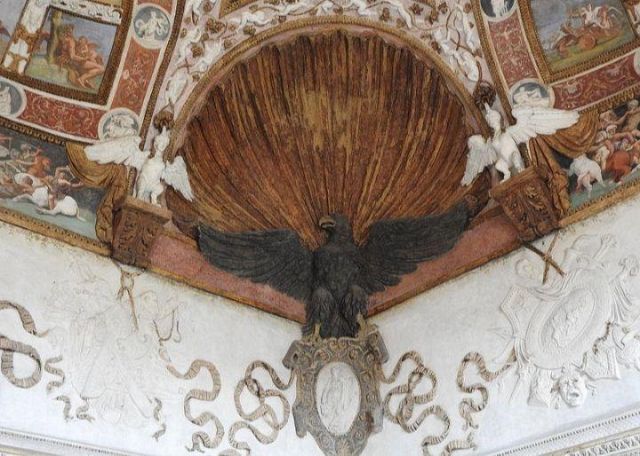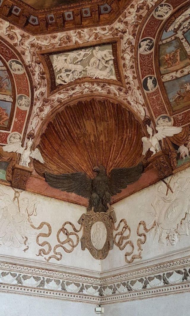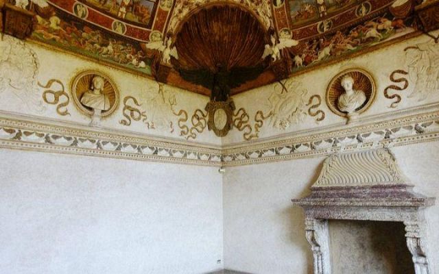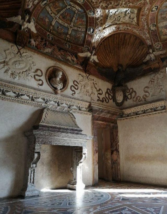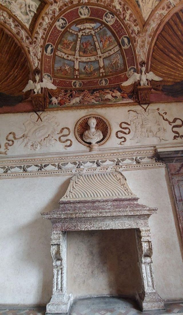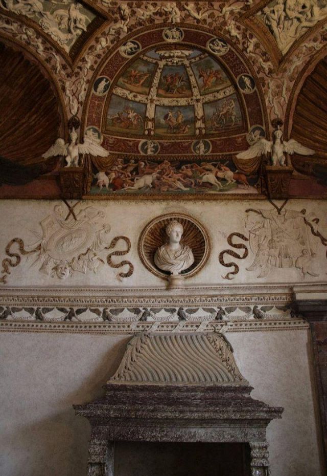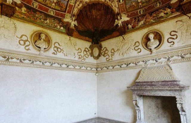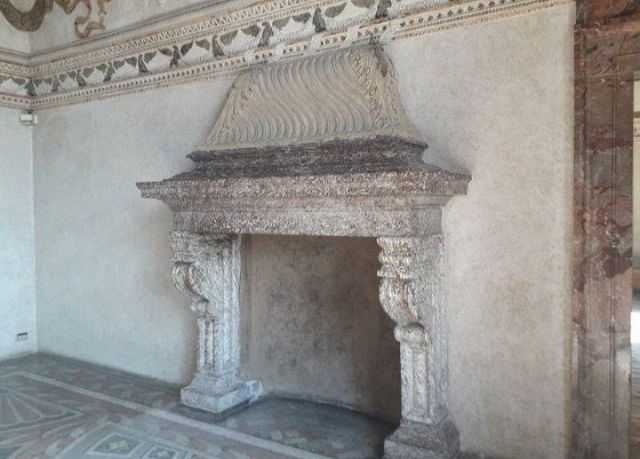 Il camino, in marmo di Brentonico come le mostre delle porte, reca i titoli di Federico II.