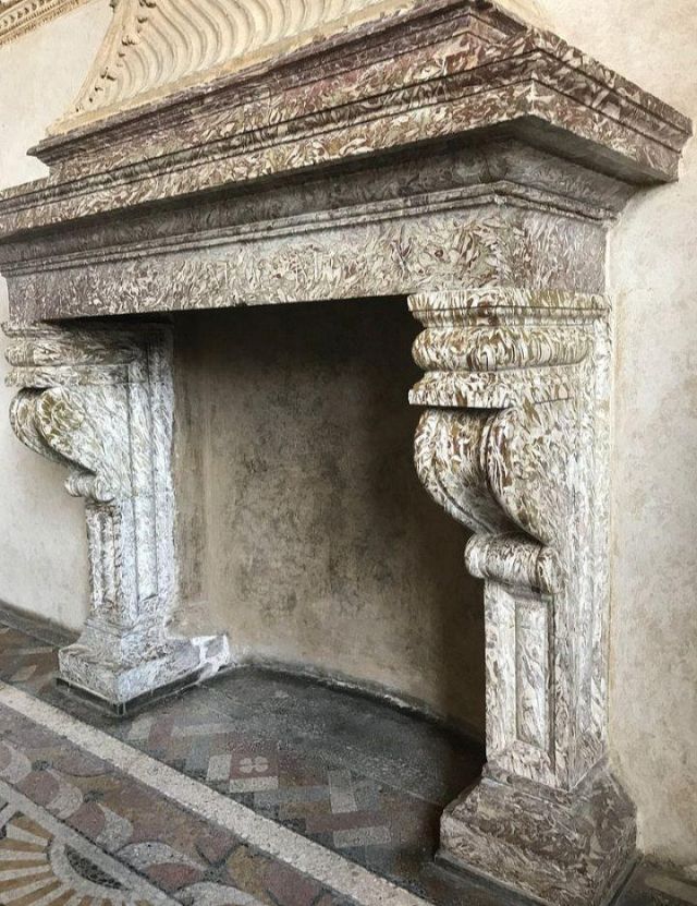 L’elegante camino è di marmo lumachella delle prealpi trentine. Di pregio ancora maggiore sono le mostre delle porte eseguite in marmo greco “portasanta”, cosiddetto perchè utilizzato per intagliare nel 1525 la Porta Santa della Basilica di San Piertro.