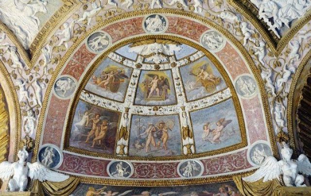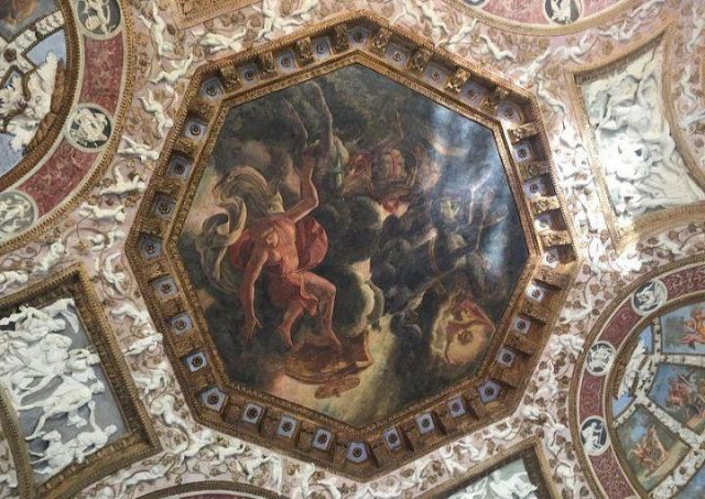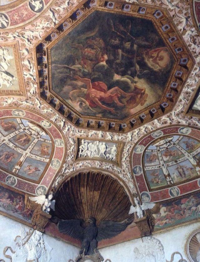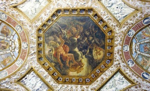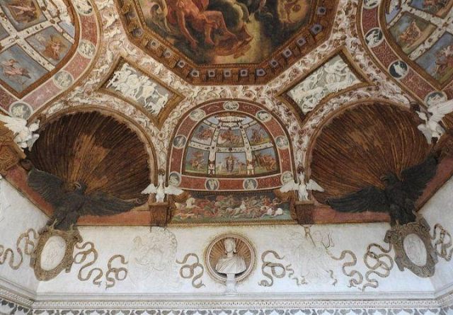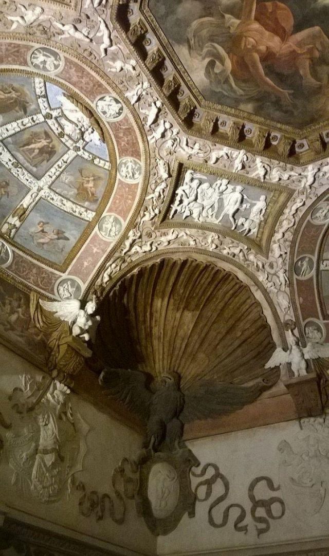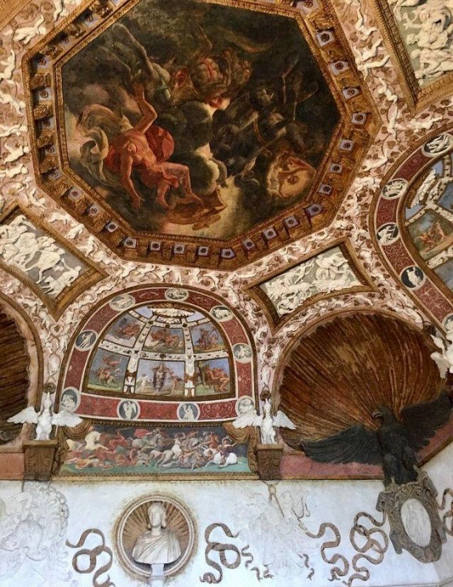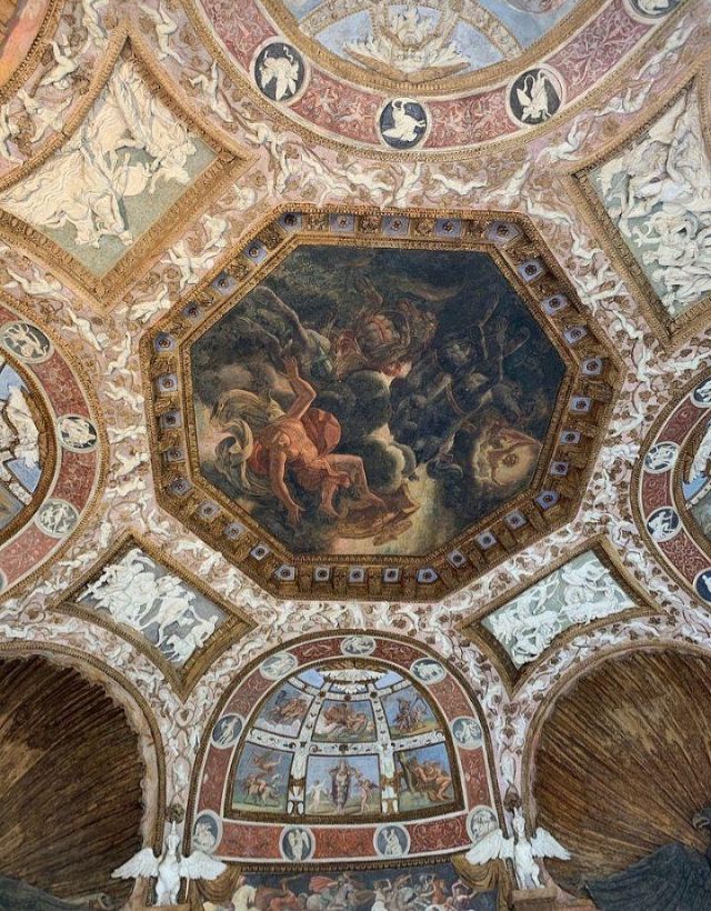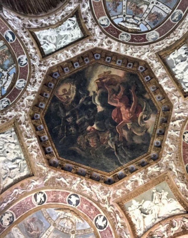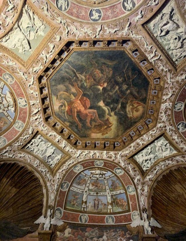 Questa decorazione è la più minuziosa dell'edificio, qui si trova l'utilizzo di marmi molto pregiati e in origine anche di decorazioni dorate a foglia d'oro zecchino. Nei quattro riquadri che circondano l'ottagono centrale si trovano i seguenti episodi: Nettuno rapisce Anfitrite, Giove che rapisce Europa, Mercurio dinanzi a Giove, Giunone e Nettuno, Plutone rapisce Proserpina. Particolari sono i profili delle porte, creati con del marmo greco chiamato "portasanta" perché utilizzato anche per la Porta Santa della Basilica di San Pietro in Vaticano.