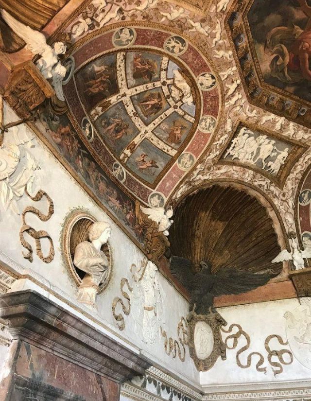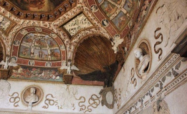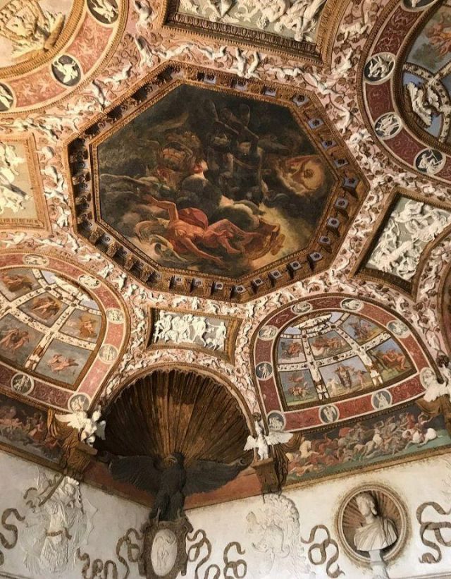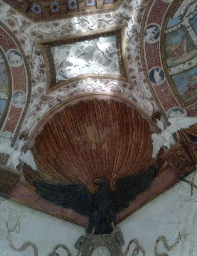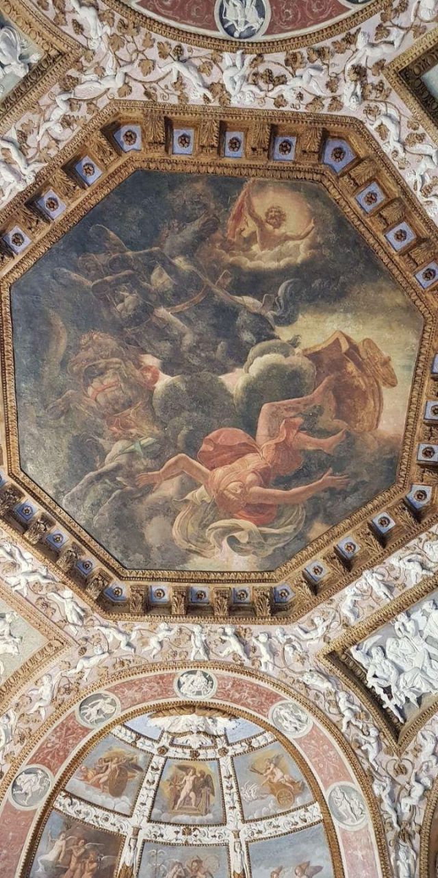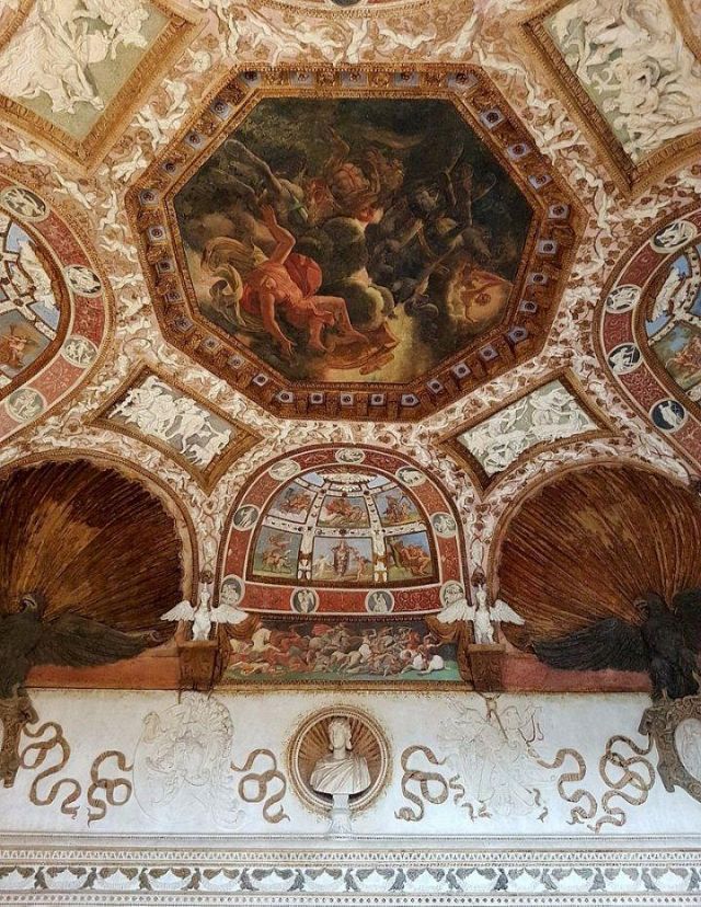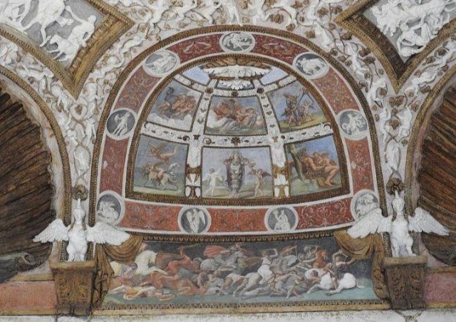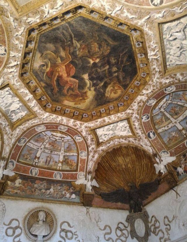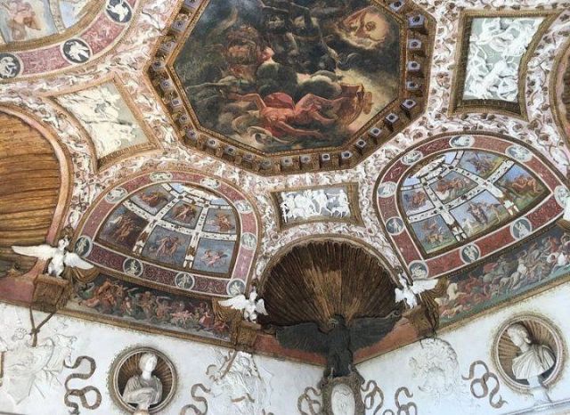 Questa decorazione è la più minuziosa dell'edificio, qui si trova l'utilizzo di marmi molto pregiati e in origine anche di decorazioni dorate a foglia d'oro zecchino. Nei quattro riquadri che circondano l'ottagono centrale si trovano i seguenti episodi: Nettuno rapisce Anfitrite, Giove che rapisce Europa, Mercurio dinanzi a Giove, Giunone e Nettuno, Plutone rapisce Proserpina. Particolari sono i profili delle porte, creati con del marmo greco chiamato "portasanta" perché utilizzato anche per la Porta Santa della Basilica di San Pietro in Vaticano.
