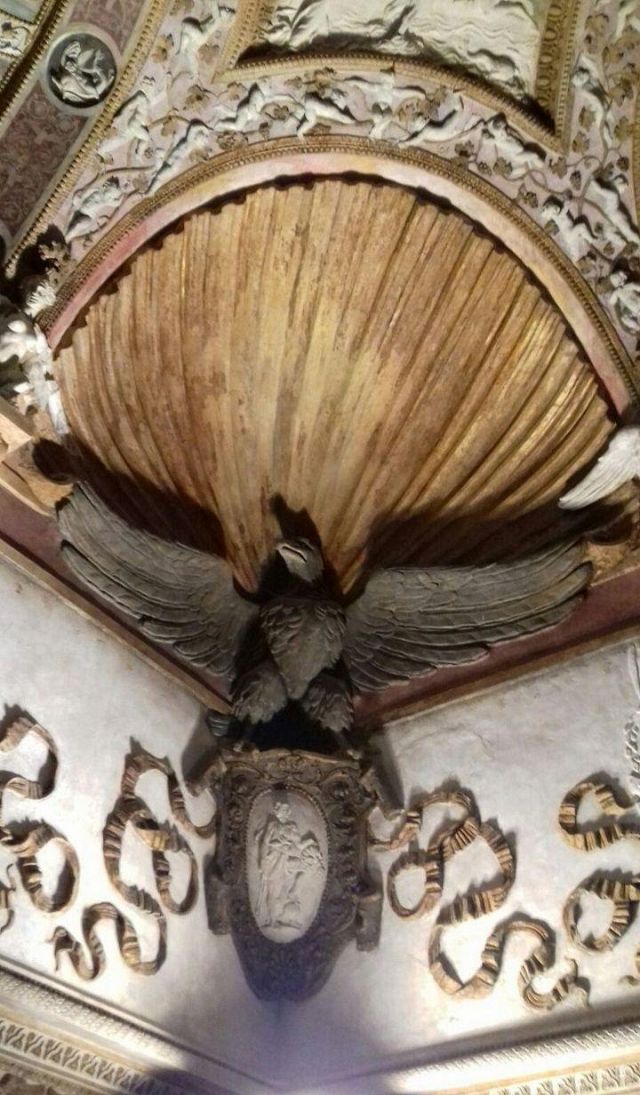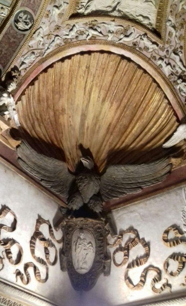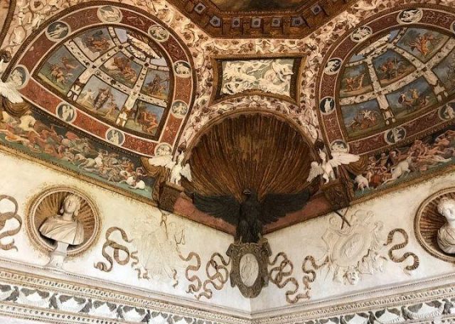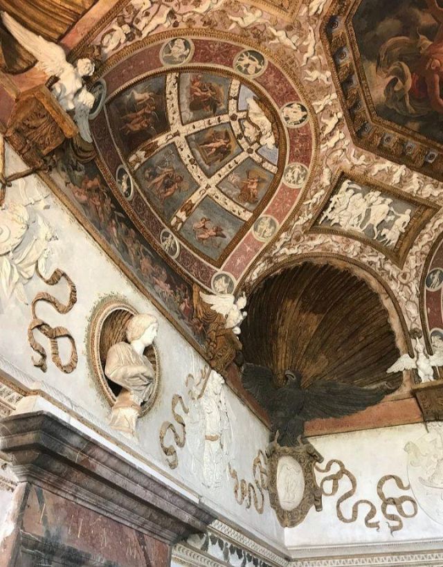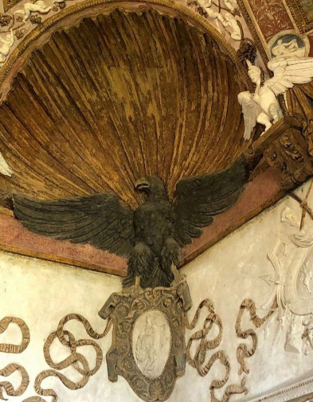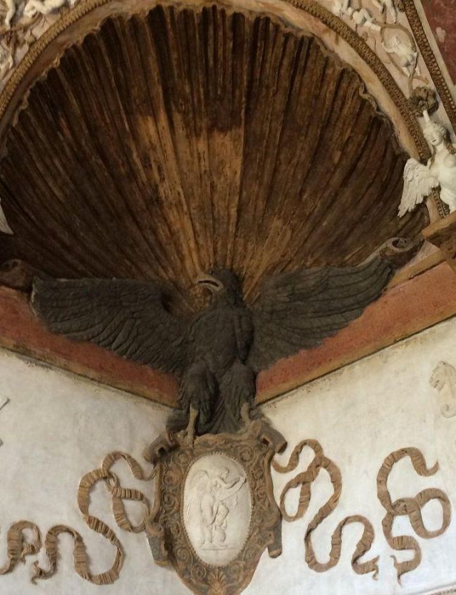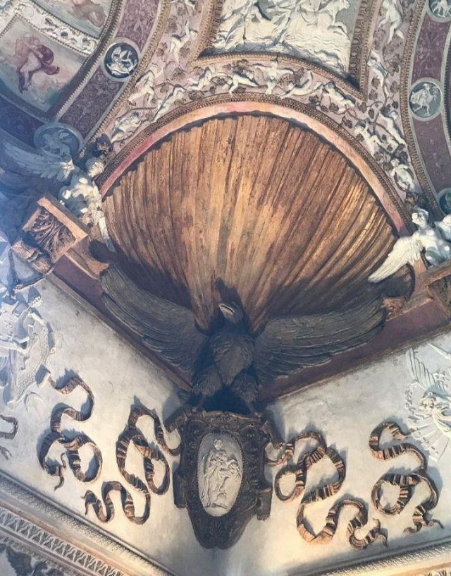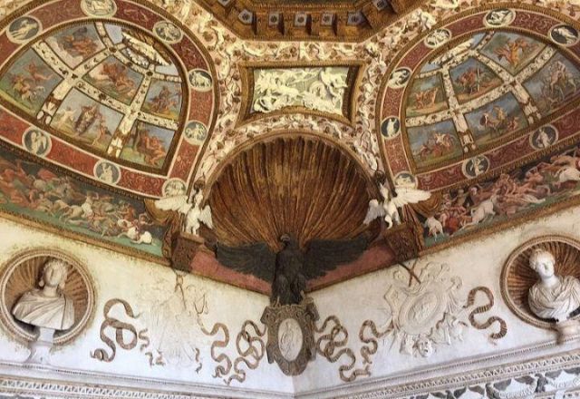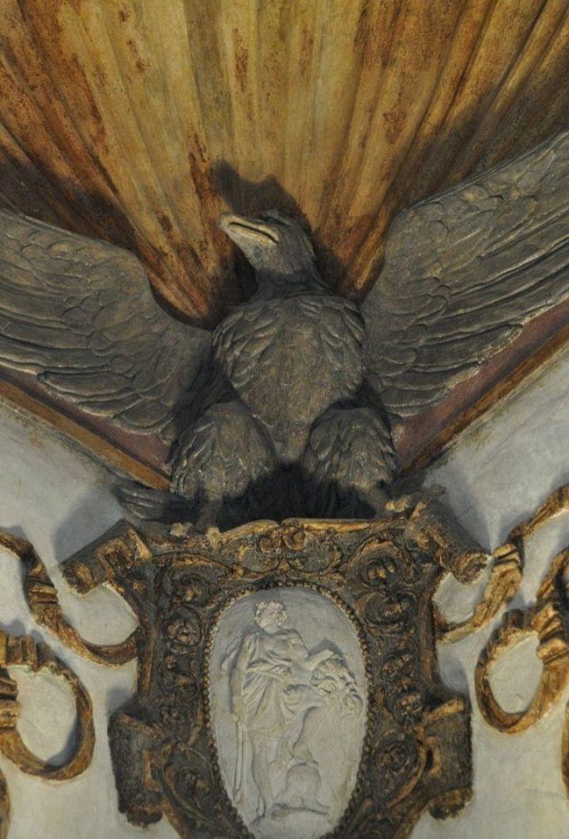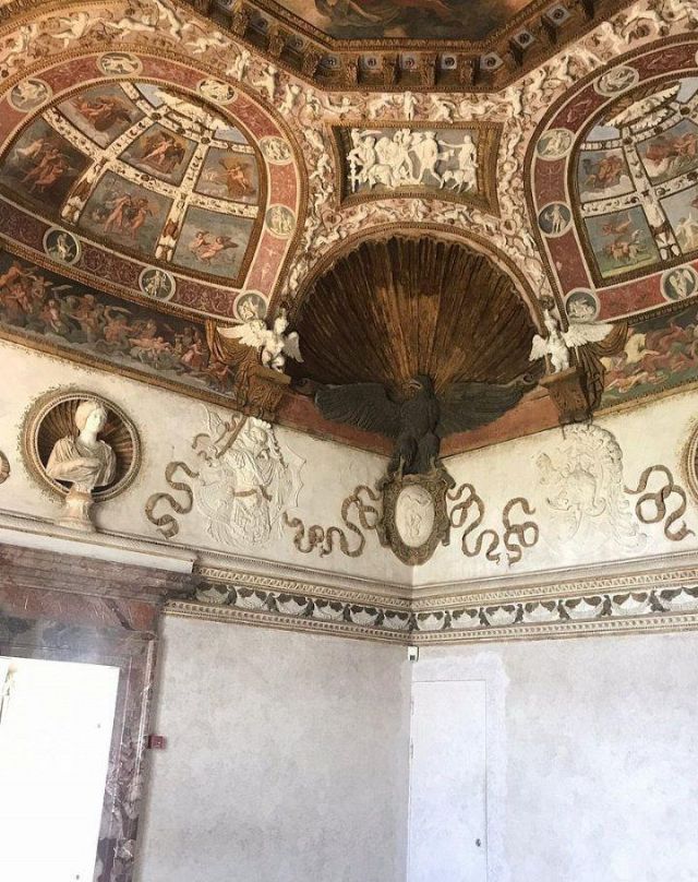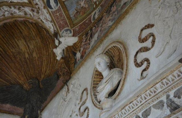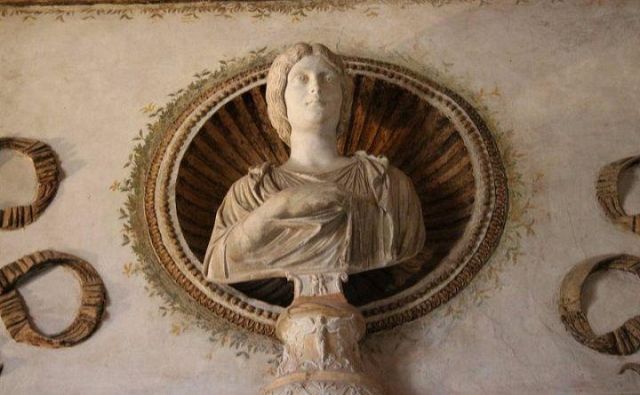 In alcune nicchie alle pareti troviamo tre busti di imperatrici romane che sorvegliavano il letto del marchese.