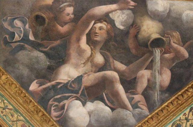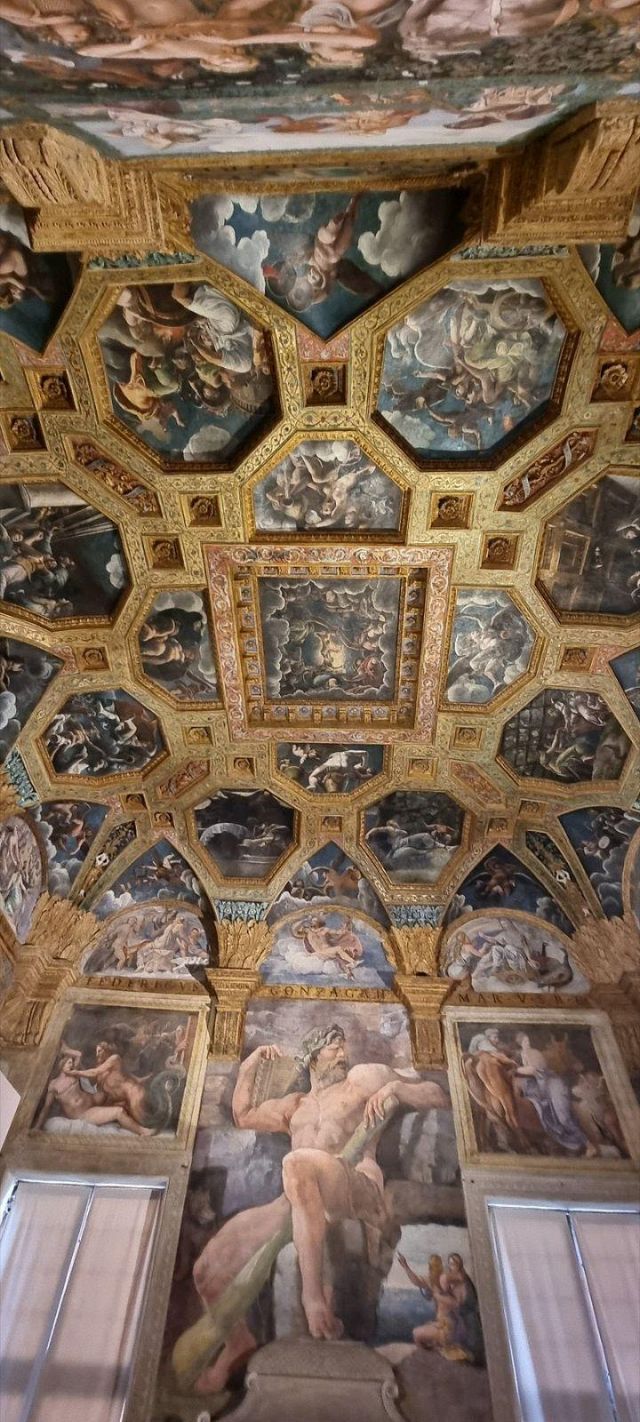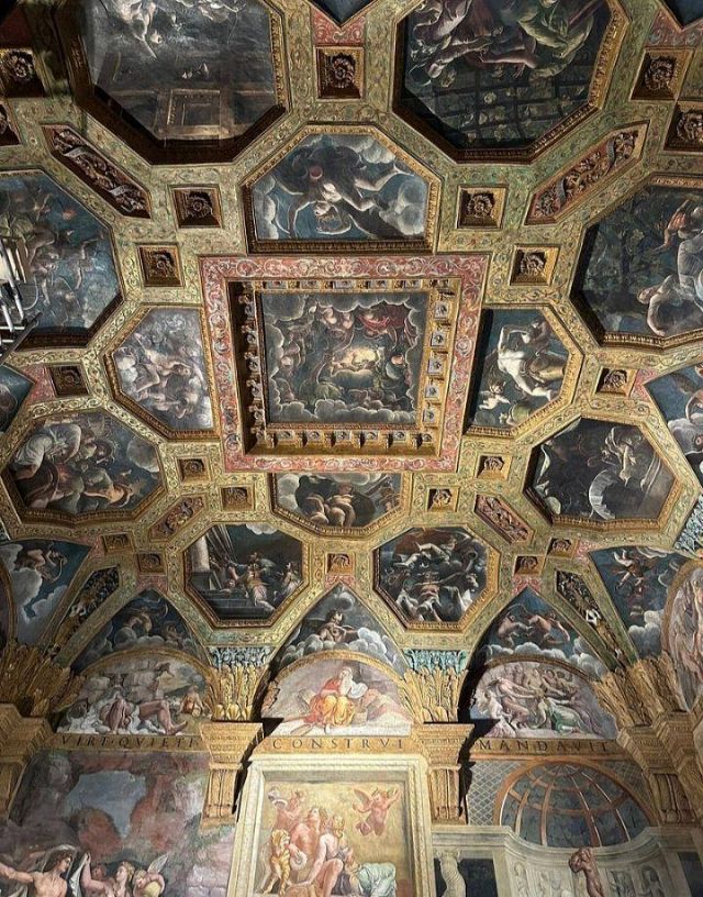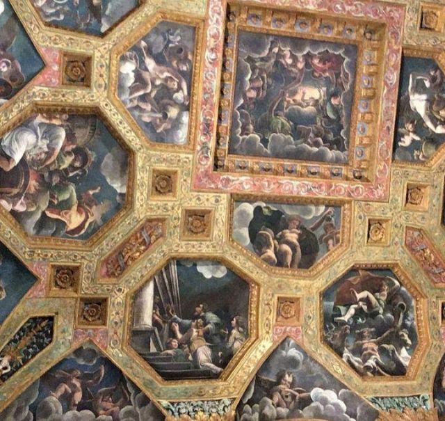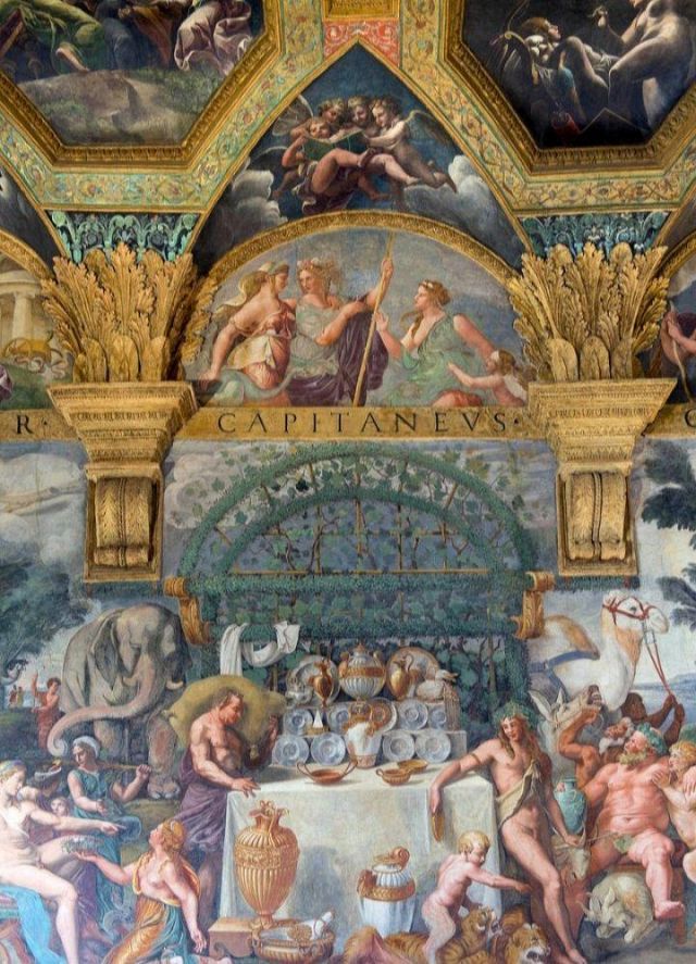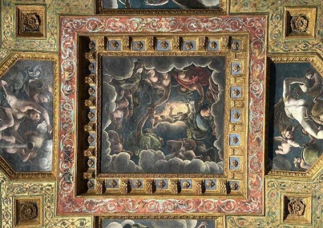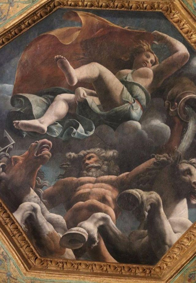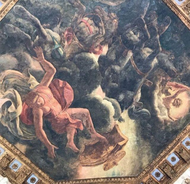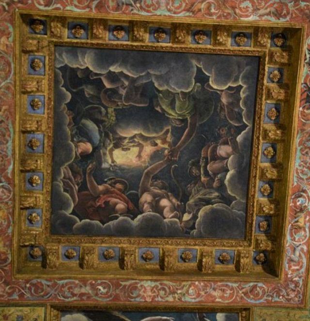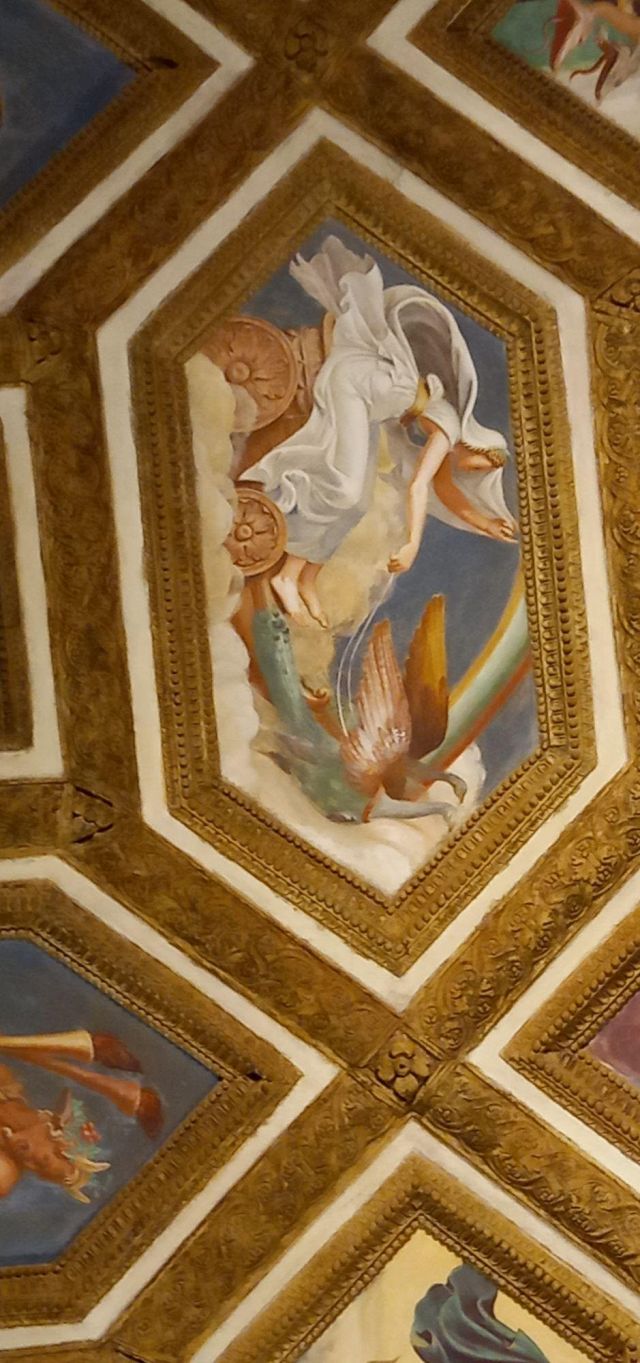 La volta vede al centro l’impresa del Monte Olimpo, circondata da divinità: partendo dall’esagono con Giunone sul carro trainato da pavoni.