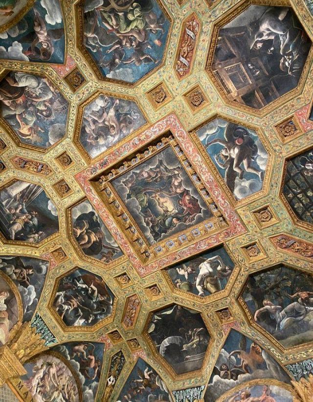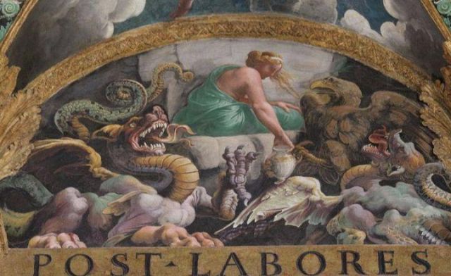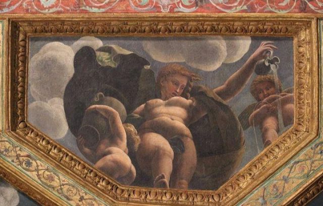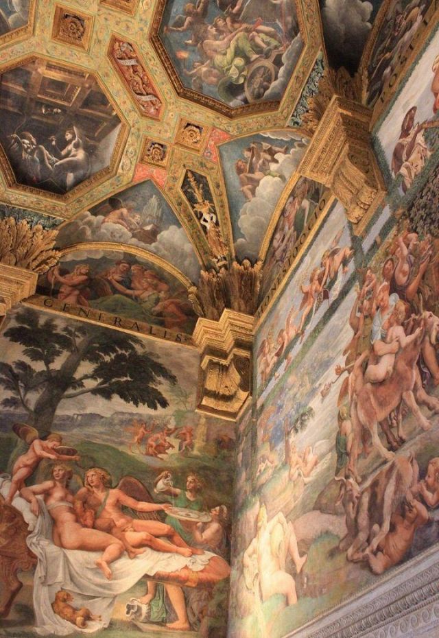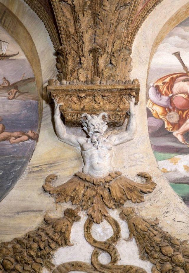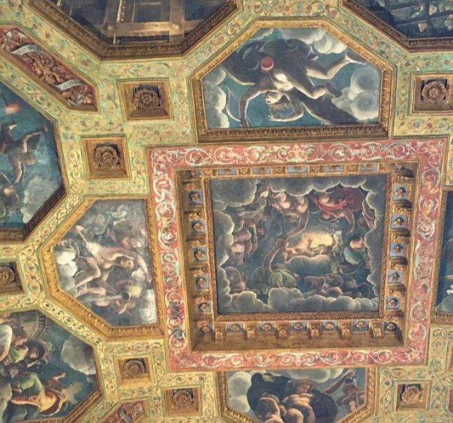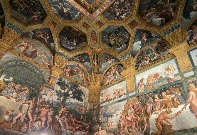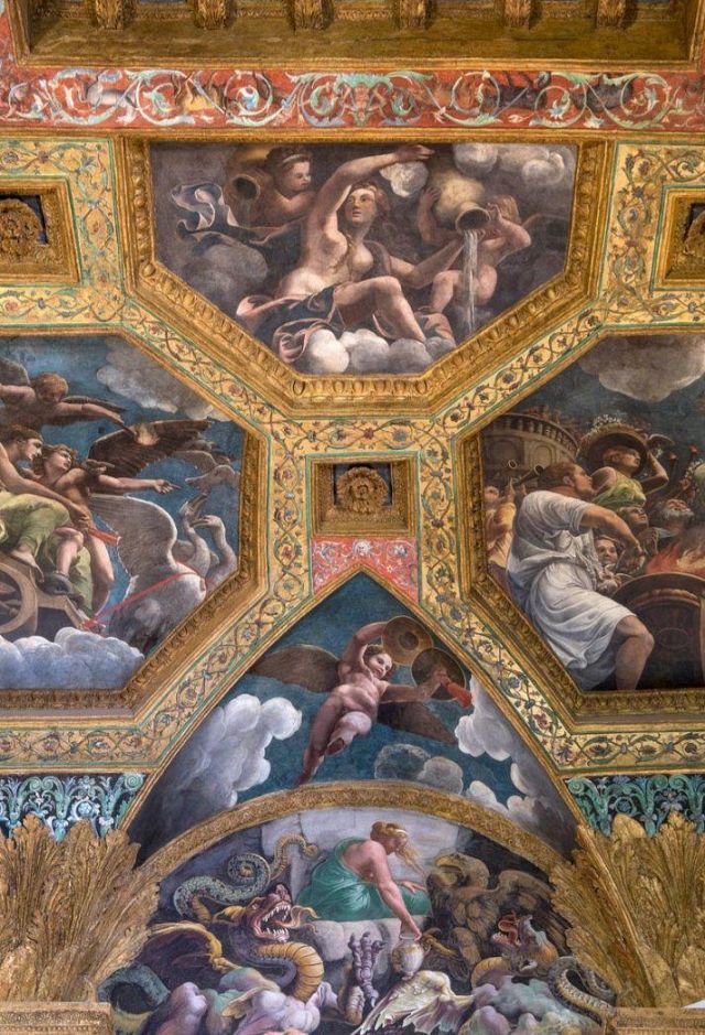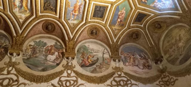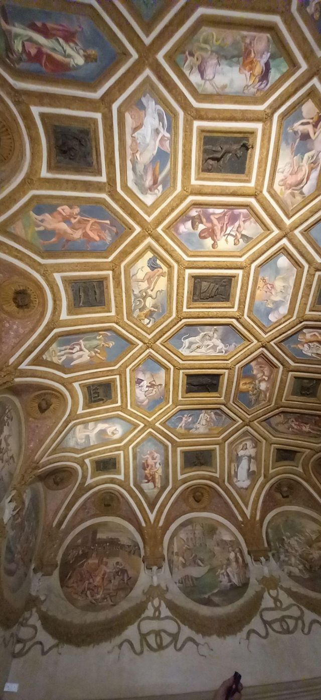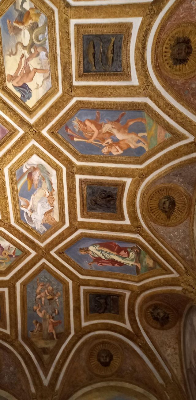 La volta vede al centro l’impresa del Monte Olimpo, circondata da divinità: partendo dall’esagono con Giunone sul carro trainato da pavoni.