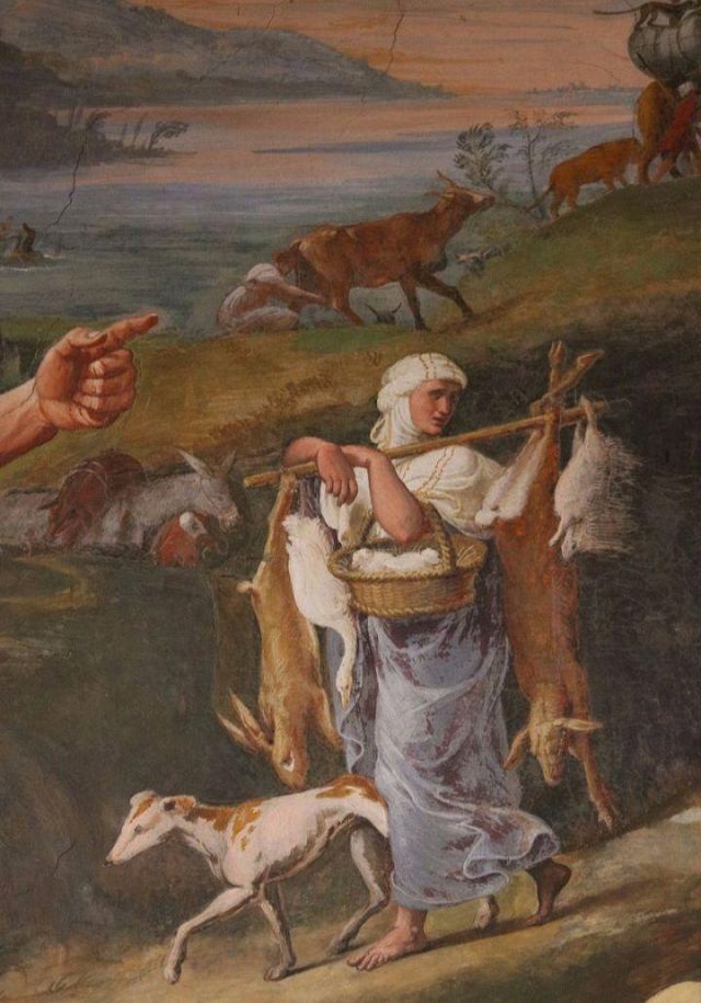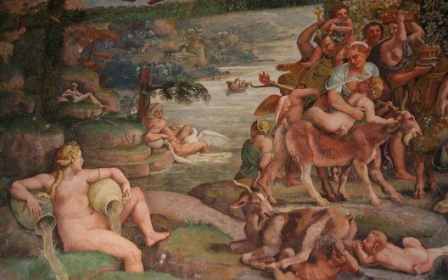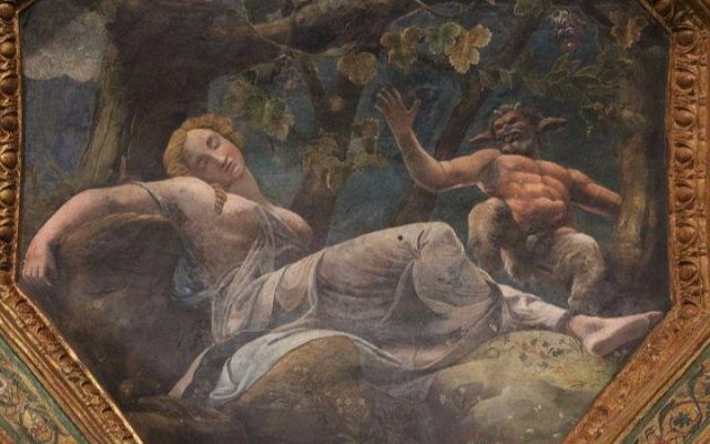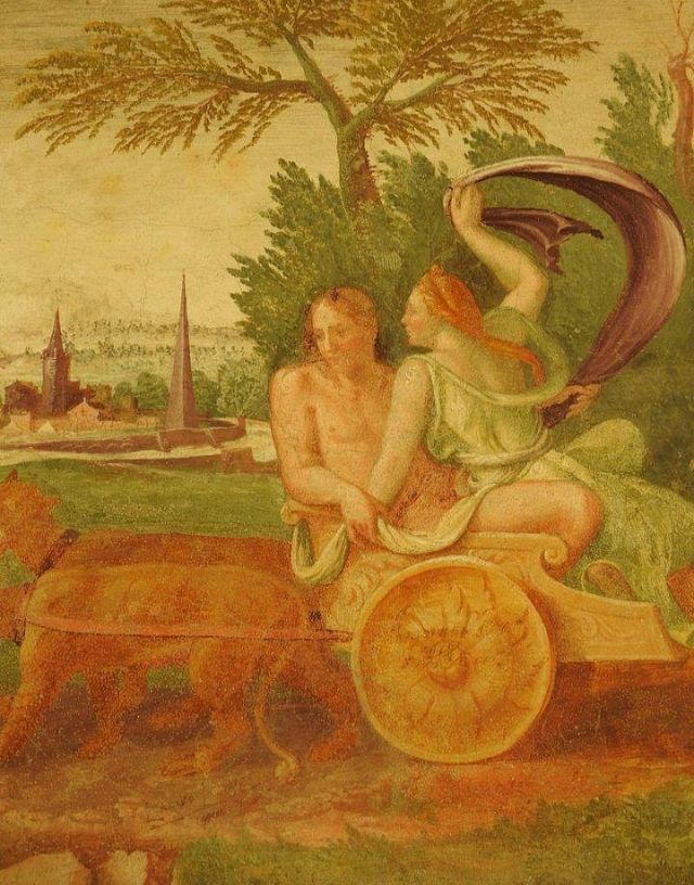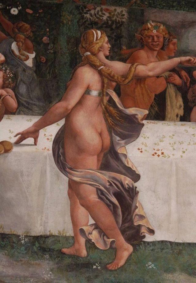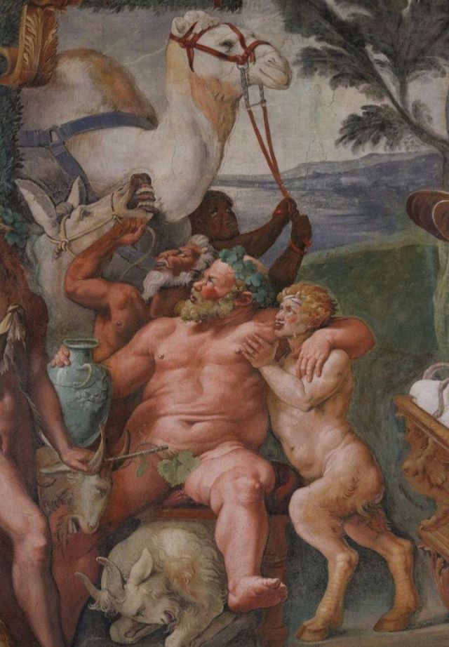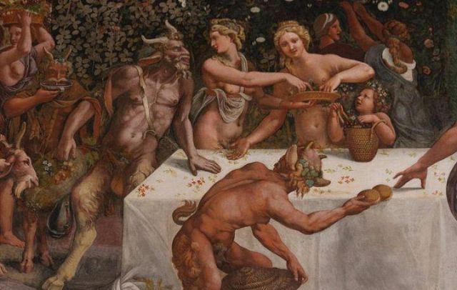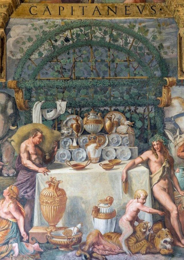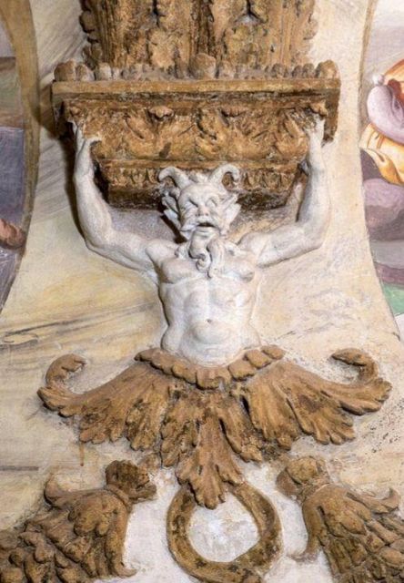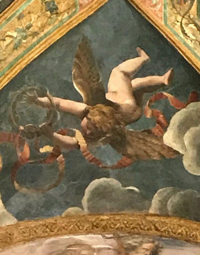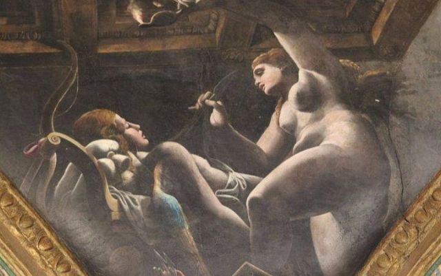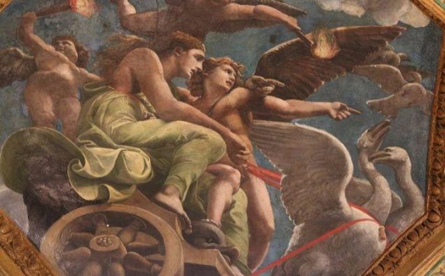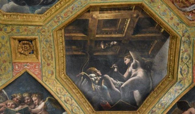 La volta vede al centro l’impresa del Monte Olimpo, circondata da divinità: partendo dall’esagono con Giunone sul carro trainato da pavoni.