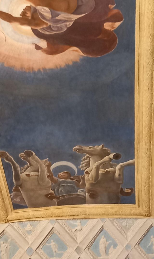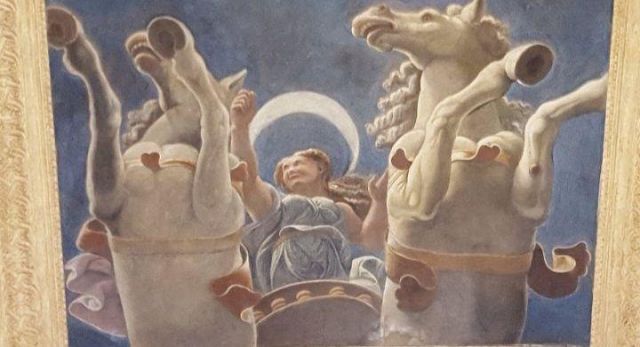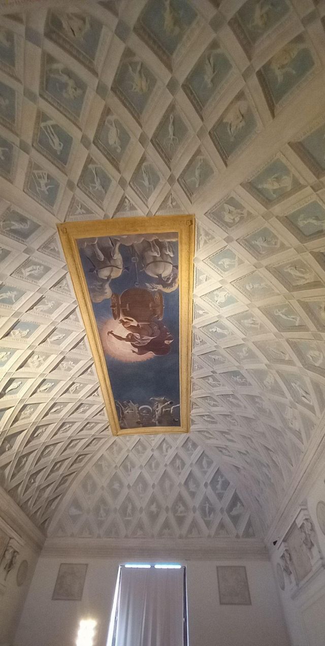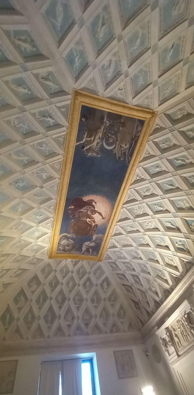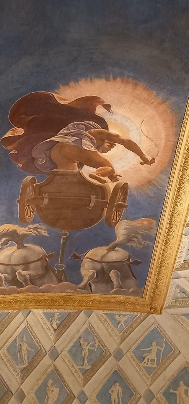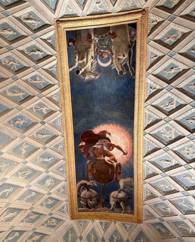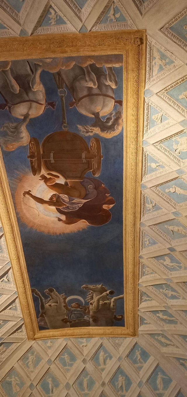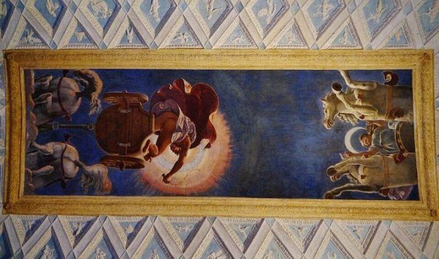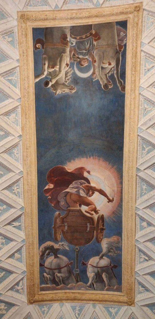 L’ambiente prende il nome dall’affresco centrale della volta che raffigura i carri del Sole e della Luna. Citata come “salotto” nei documenti, la camera aveva la funzione di introdurre gli ospiti alle salette più riservate delle Imprese e di Ovidio. Alla sommità dell’ampia volta a schifo si apre uno sfondato prospettico che raffigura l’allegoria del carro del Sole al tramonto e quello della Luna che spunta, metafora del trascorrere incessante del tempo. Una lunga tradizione vuole che l’affresco sia stato eseguito dal più brillante allievo di Giulio Romano: il bolognese Francesco Primaticcio.