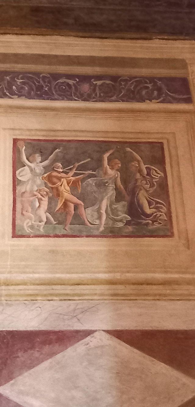 Questo ambiente, detto "camerino" per le ridotte dimensioni,[9] costituisce la seconda stanza di un appartamento che ha la camera del Sole e della Luna come ingresso. Il camino è di marmo rosso di Verona, sormontato da una cappa di stucco a finto marmo che riporta la scritta "F(edericus) II G(onzaga) M(archio) M(antuae) V", ovvero Federico II Gonzaga quinto marchese di Mantova. La parte pittorica occupa il fregio e a partire dalla parete d'ingresso i soggetti ispirati alla mitologia sono: Orfeo agli Inferi, Punizione di Marsia , Il giudizio di Paride, Bacco e Arianna, Danza di satiri e menadi, La sfida tra Apollo e Pan, Dioniso ebbro, Menadi che tormentano un satiro. Il soffitto originale ha subito vari danni a causa dell'utilizzo della stanza come abitazione.