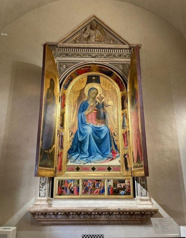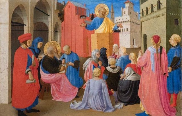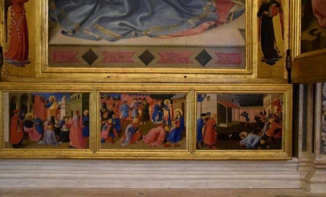 Predella Il primo pannello della predella mostra San Pietro che detta il Vangelo a san Marco. Vi si vede il primo apostolo che da un pulpito ligneo a base esagonale predica alla folla mentre a sinistra san Marco seduto sta scrivendo, con l'aiuto di un novizio inginocchiato che gli regge il calamaio. Partecipano alla scena numerosi personaggi abbigliati secondo la moda dell'epoca, mentre lo sfondo è composto da una serie di edifici in prospettiva, che ricordano, più o meno fedelmente, scorci dell'architettura fiorentina dipinti con notevole rifinizione (il campanile della Badia, palazzo Vecchio, ecc.).