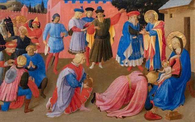 Il pannello centrale presenta un'innovativa Adorazione dei Magi, dove al posto del tradizionale corteo disposto orizzontalmente come un fregio (come nell'Annunciazione di Cortona) si trova una composizione di tipo circolare. La Vergine col Bambino è sempre seduta sulla destra a ricevere l'omaggio di due Magi, mentre il resto del corteo è disposto su una fila parallela in secondo piano, con il terzo magio occupato a parlare con san Giuseppe. Nella testa del giovane tra i due cavalli, dipinta con una tecnica pointillista, si è voluta riconoscere la mano del giovane Piero della Francesca.