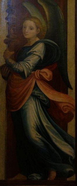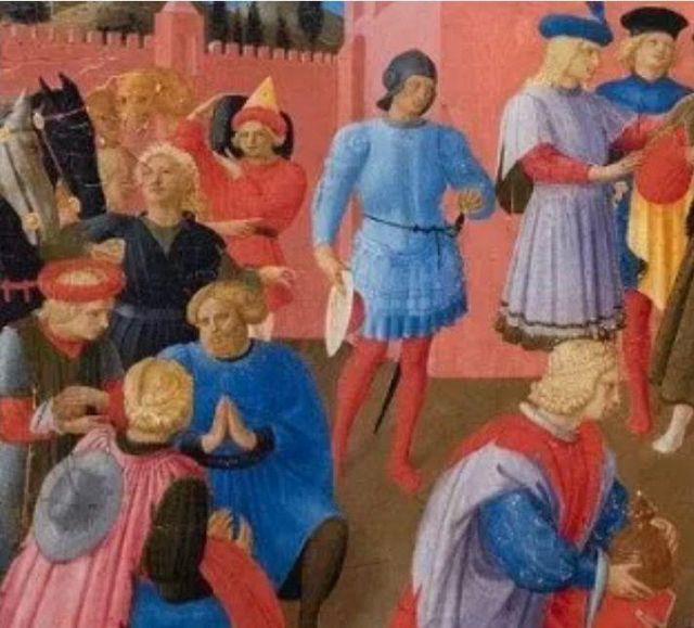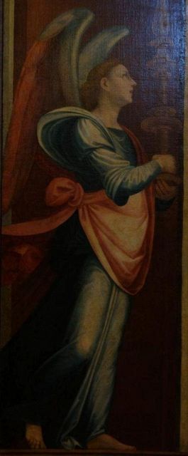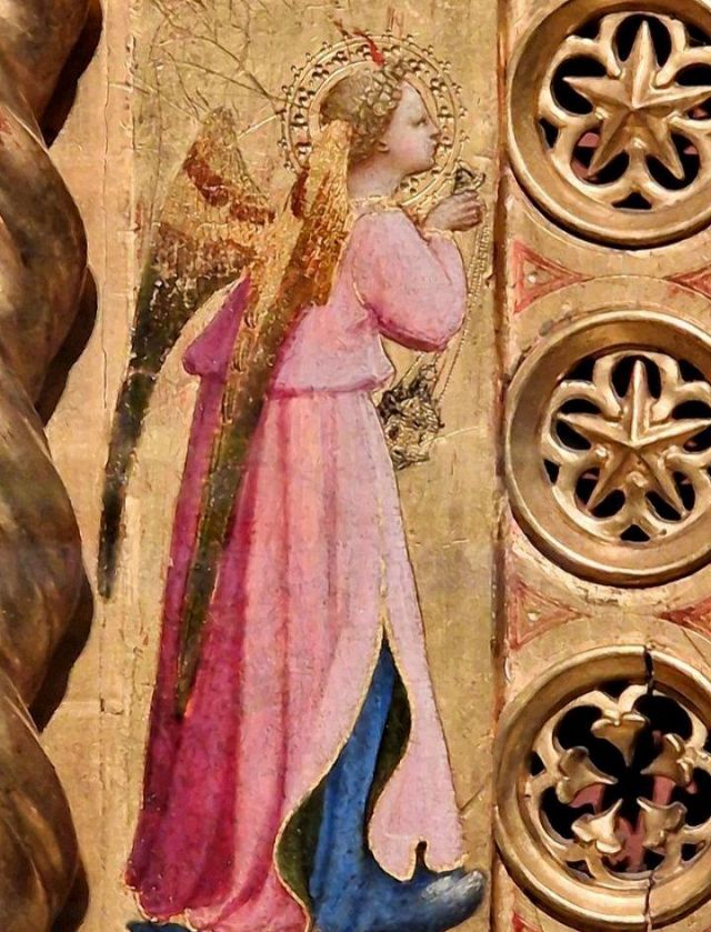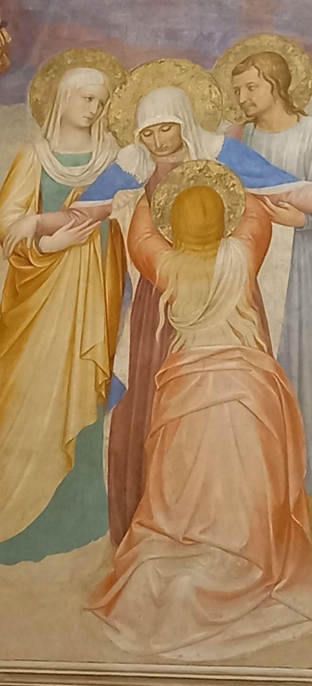 Il cielo che in antico era blu, ma che la caduta del pigmento dell'azzurrite (o "blu d'Alemania") ha reso violaceo, scoprendo la preparazione rossiccia sottostante.