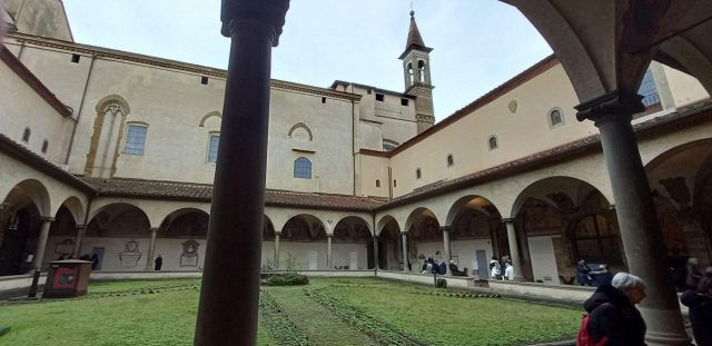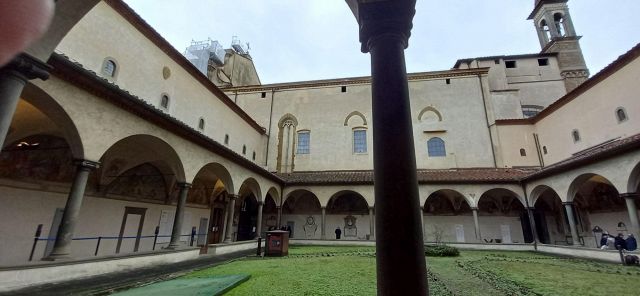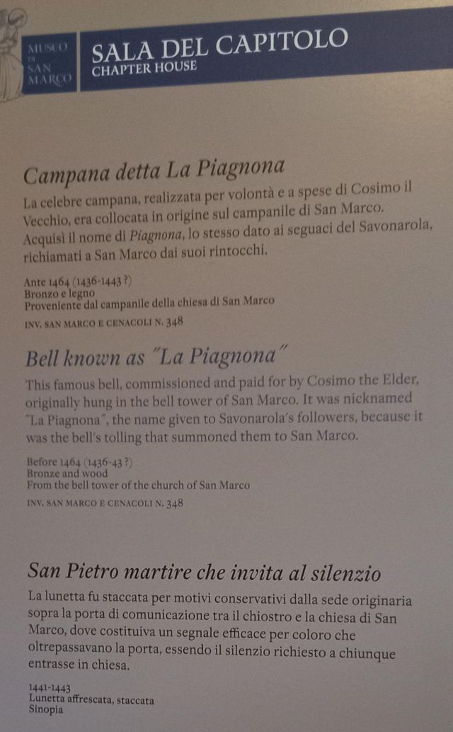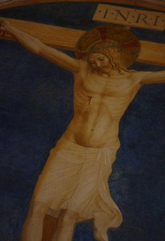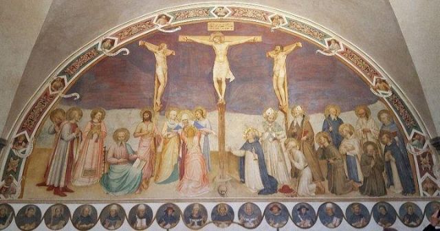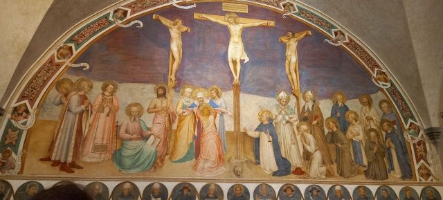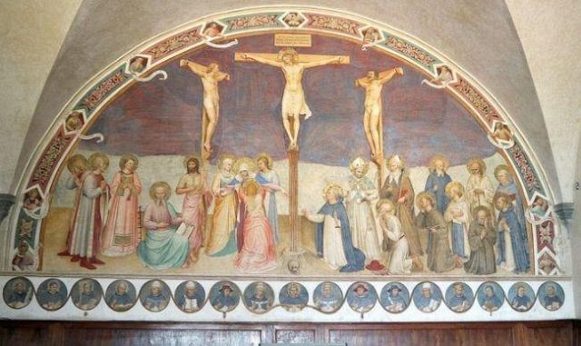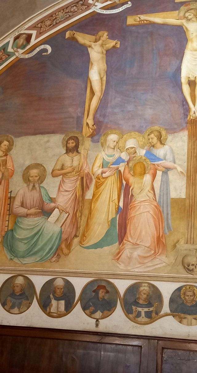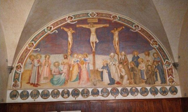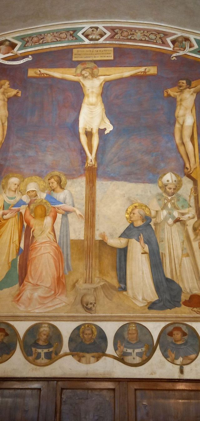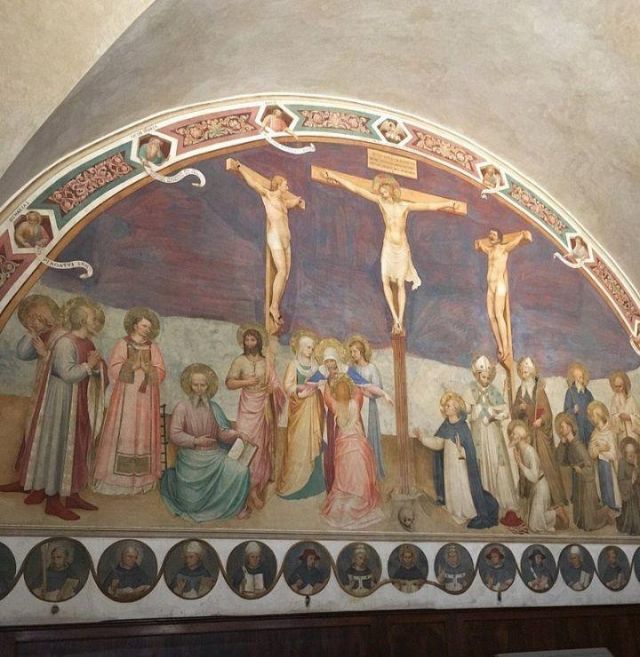 La Crocifissione della sala capitolare rappresenta l'unico caposaldo nella datazione del ciclo decorativo, poiché l'Angelico vi stava sicuramente lavorando nel 1441-1442. Da un atto notarile datato 22 agosto 1441 si apprende infatti che a quella data il Capitolo, a cui partecipava anche l'Angelico, si riuniva nella nuova sagrestia perché la sala non era ancora pronta; da un documento del 25 agosto 1442 si legge poi che le riunioni del Capitolo avevano già ottenuto la loro sede definitiva