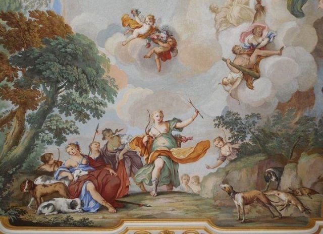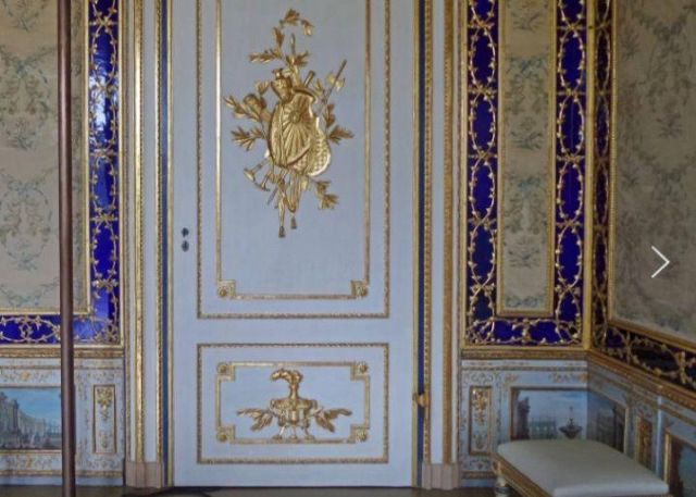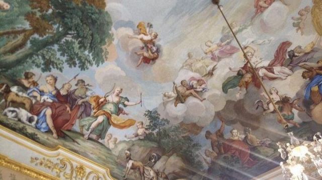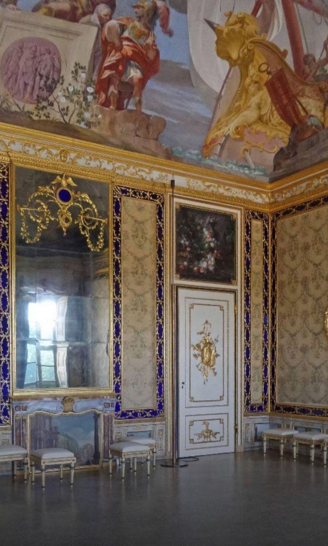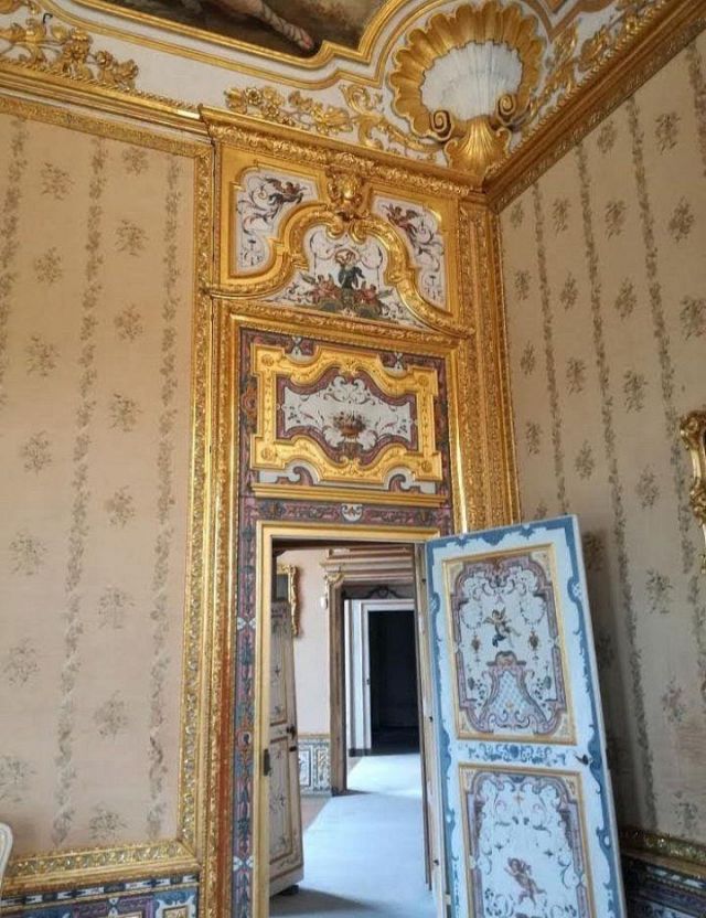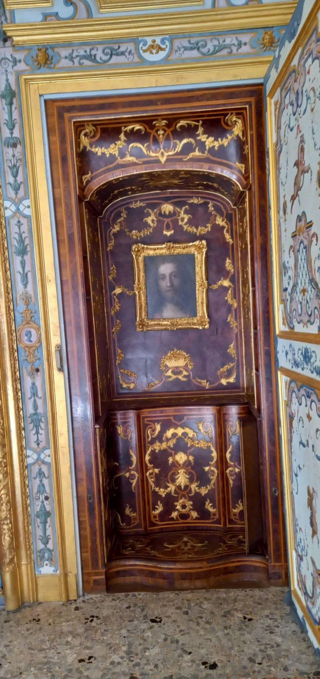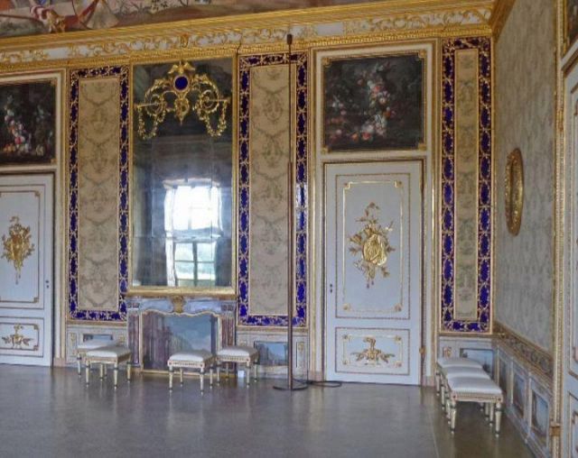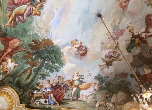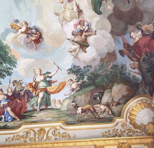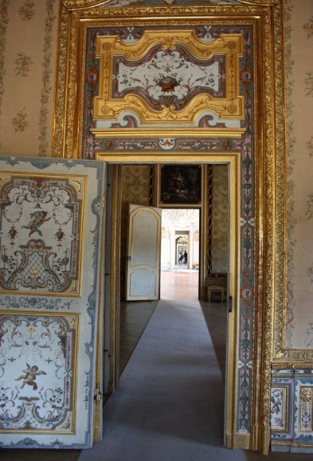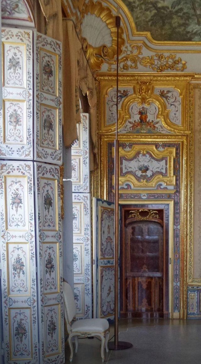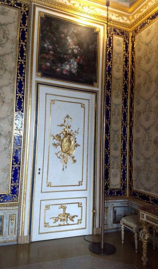 Fu sempre Casoli a realizzare i pannelli delle porte volanti che furono poi sostituite da quelle che si vedono attualmente, con trofei di caccia eseguiti da Giuseppe Maria Bonzanigo, lo stesso l’autore delle splendide incorniciature delle pareti con tralci di edera dorata su fondo di vetro blu.