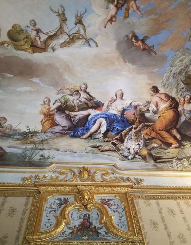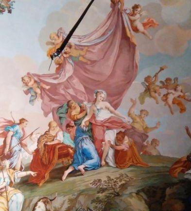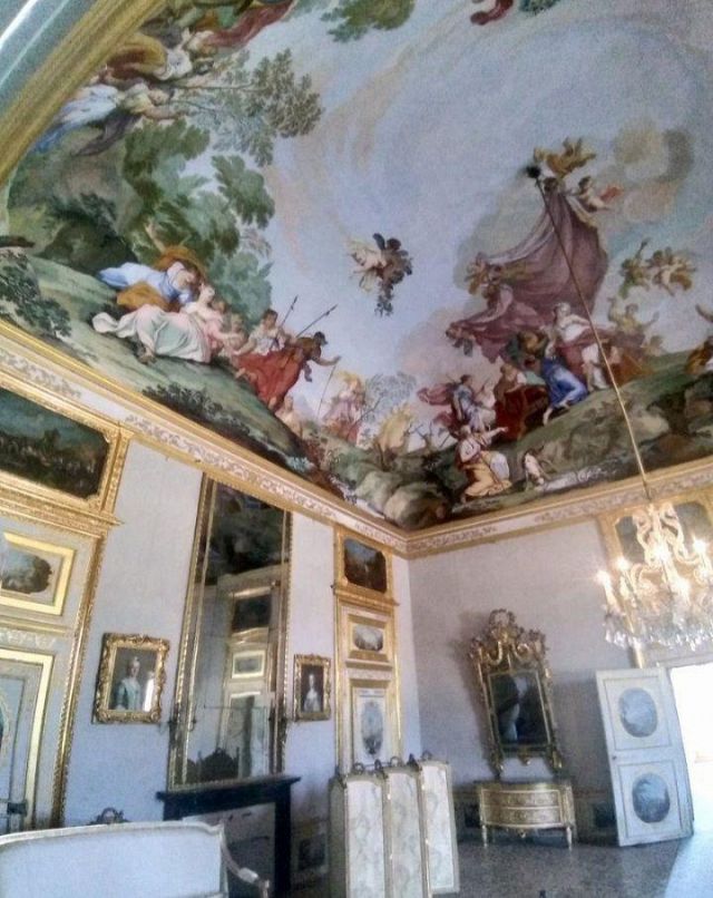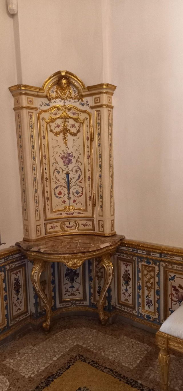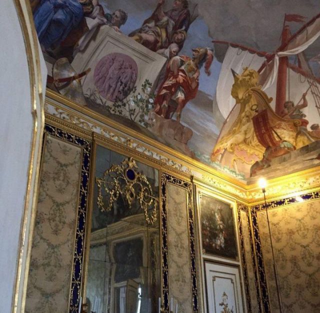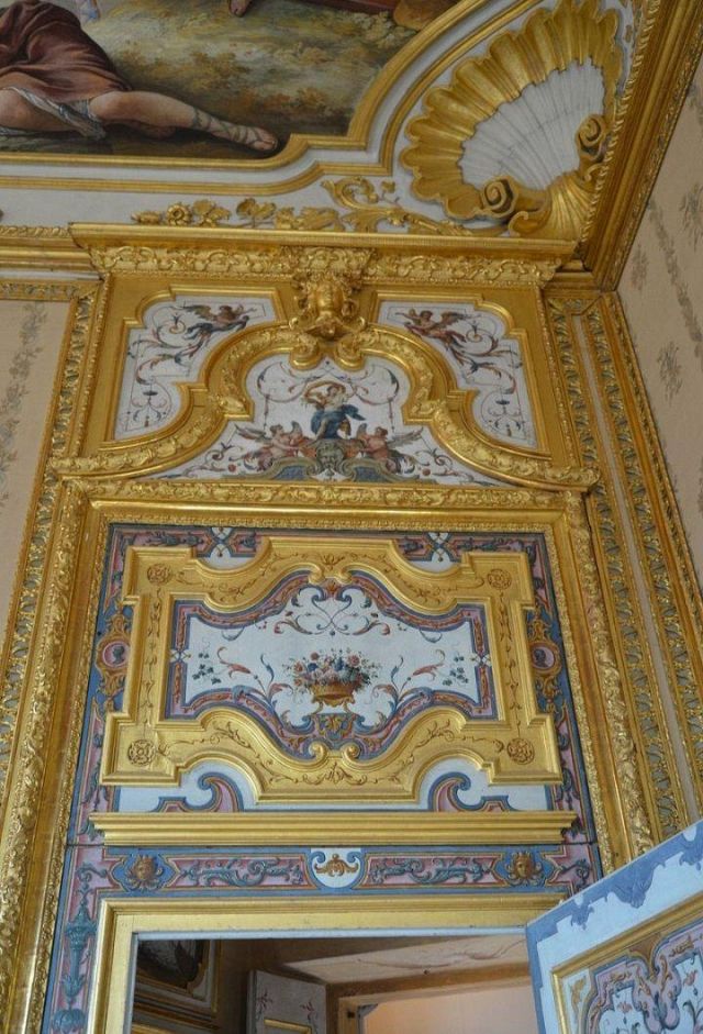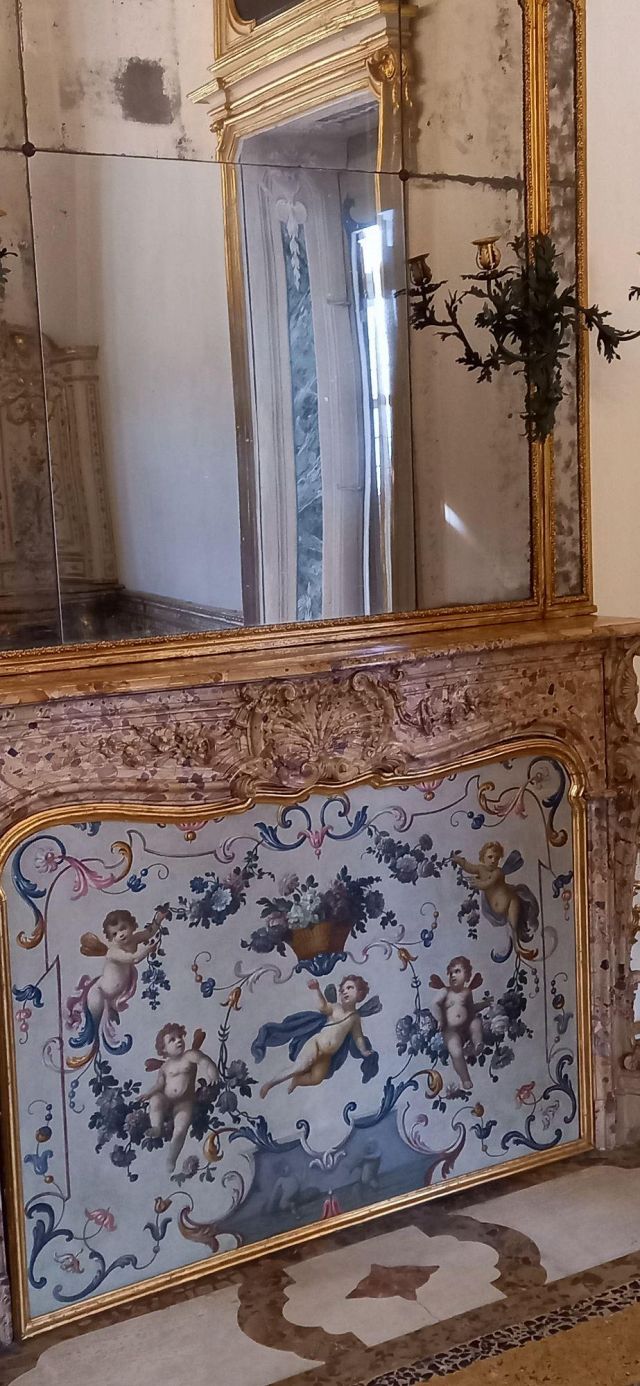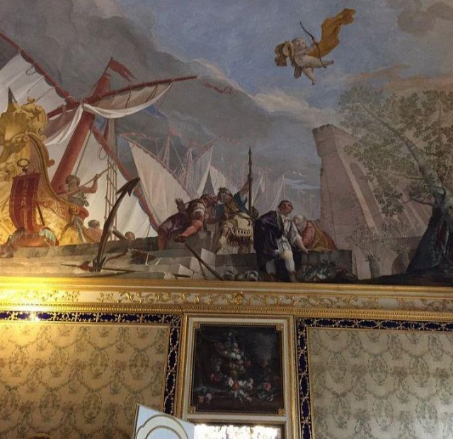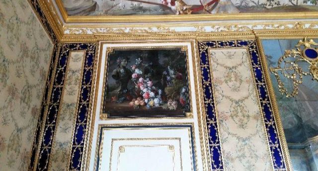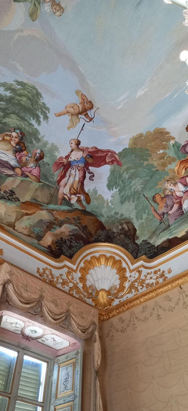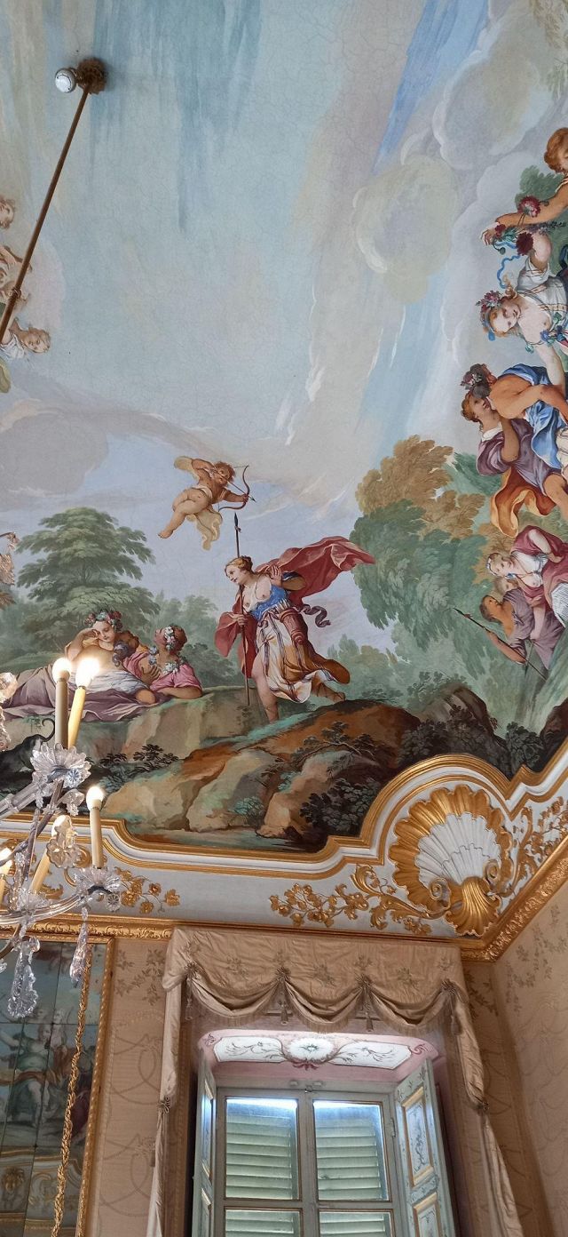 Fu sempre Casoli a realizzare i pannelli delle porte volanti che furono poi sostituite da quelle che si vedono attualmente, con trofei di caccia eseguiti da Giuseppe Maria Bonzanigo, lo stesso l’autore delle splendide incorniciature delle pareti con tralci di edera dorata su fondo di vetro blu.