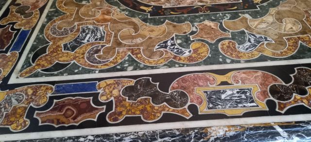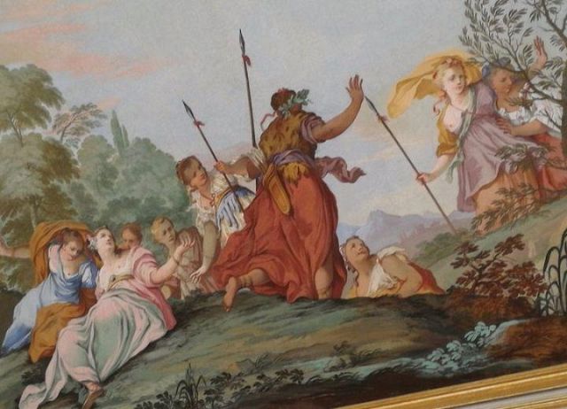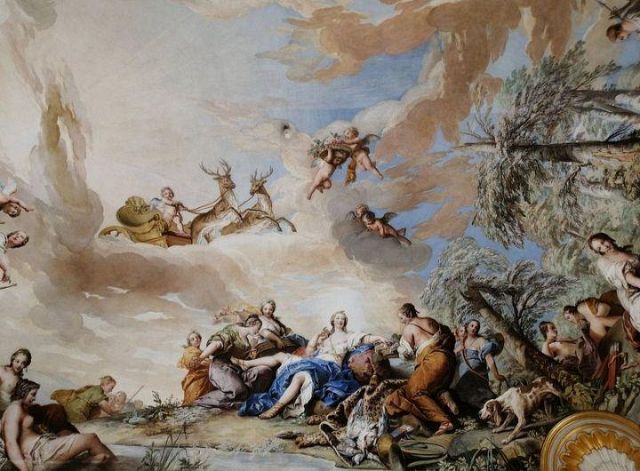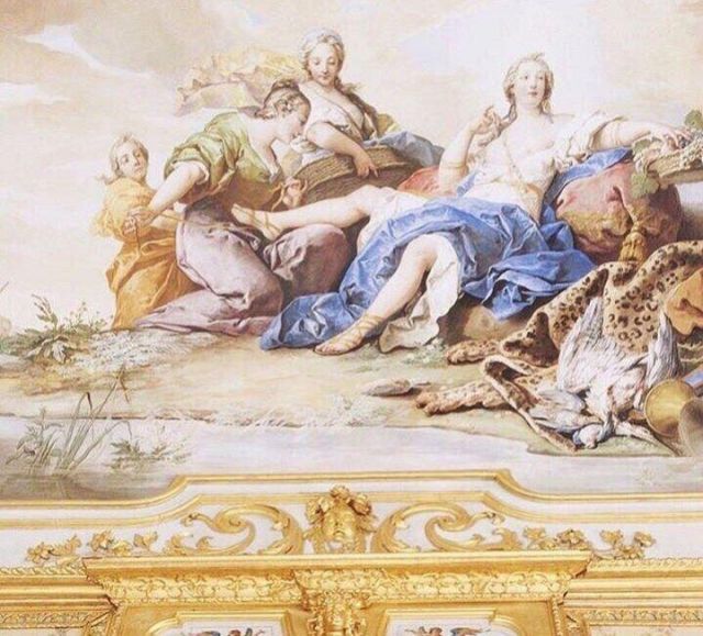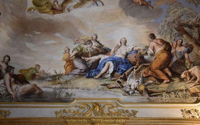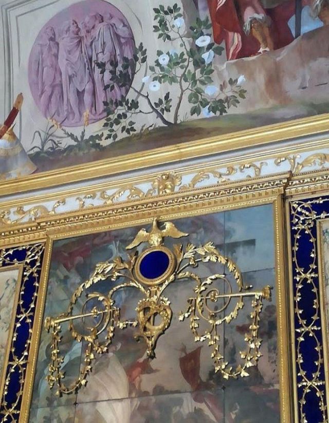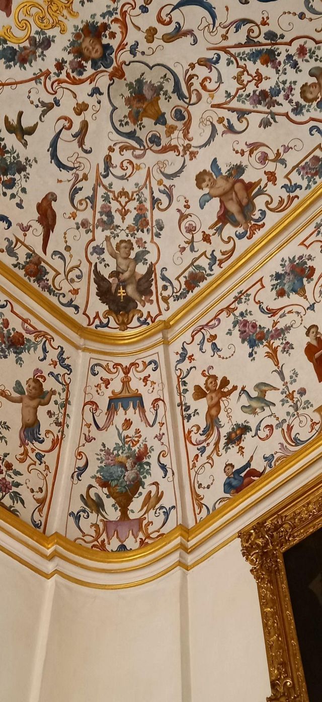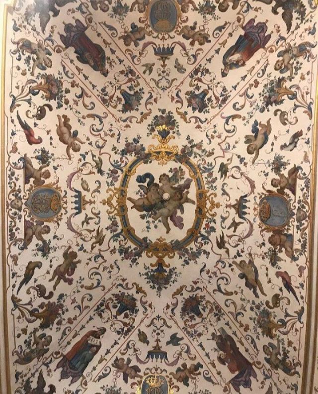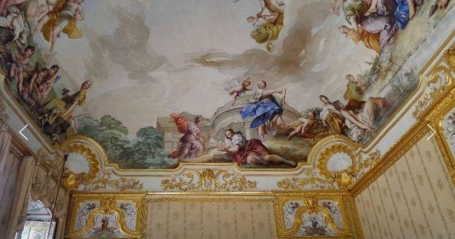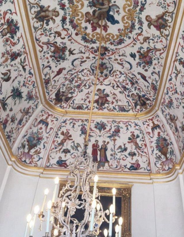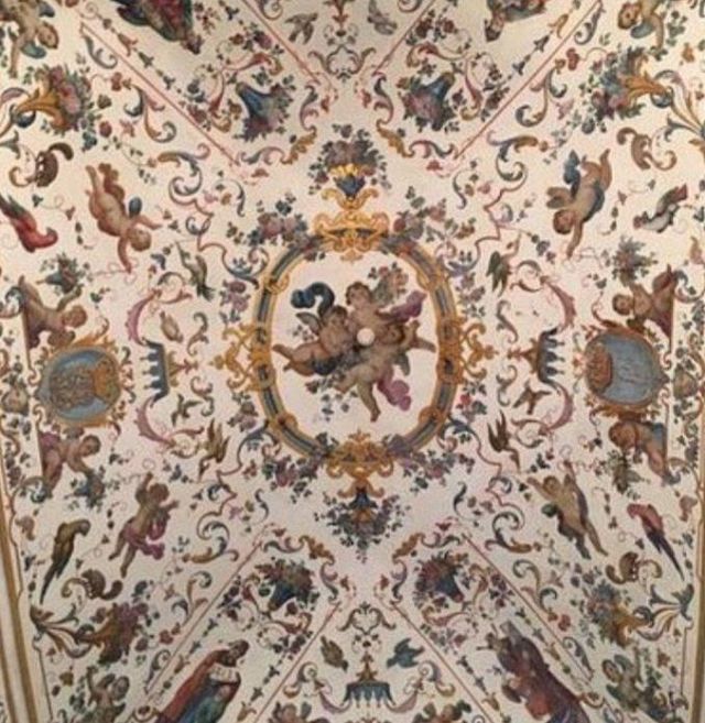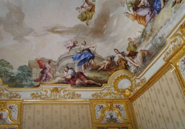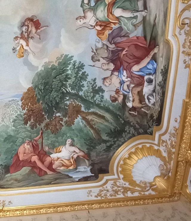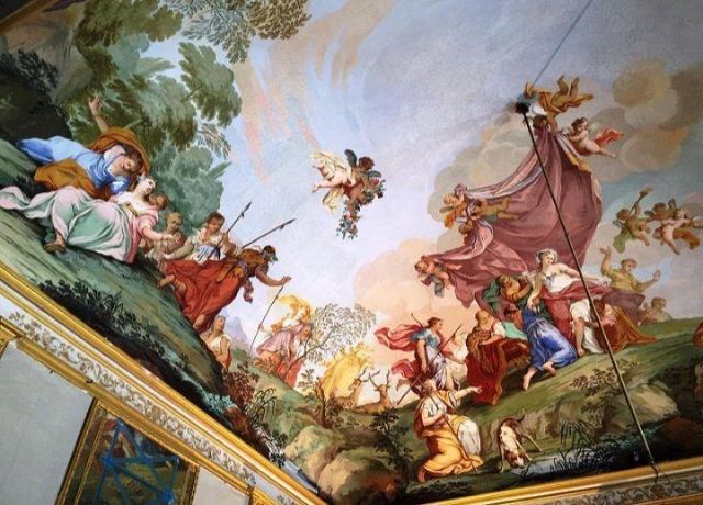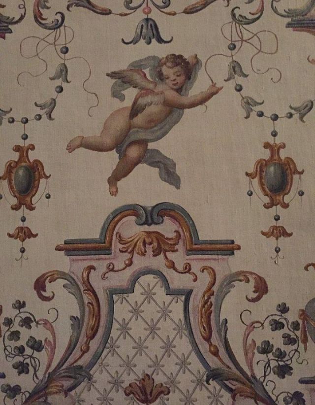 Fu sempre Casoli a realizzare i pannelli delle porte volanti che furono poi sostituite da quelle che si vedono attualmente, con trofei di caccia eseguiti da Giuseppe Maria Bonzanigo, lo stesso l’autore delle splendide incorniciature delle pareti con tralci di edera dorata su fondo di vetro blu.